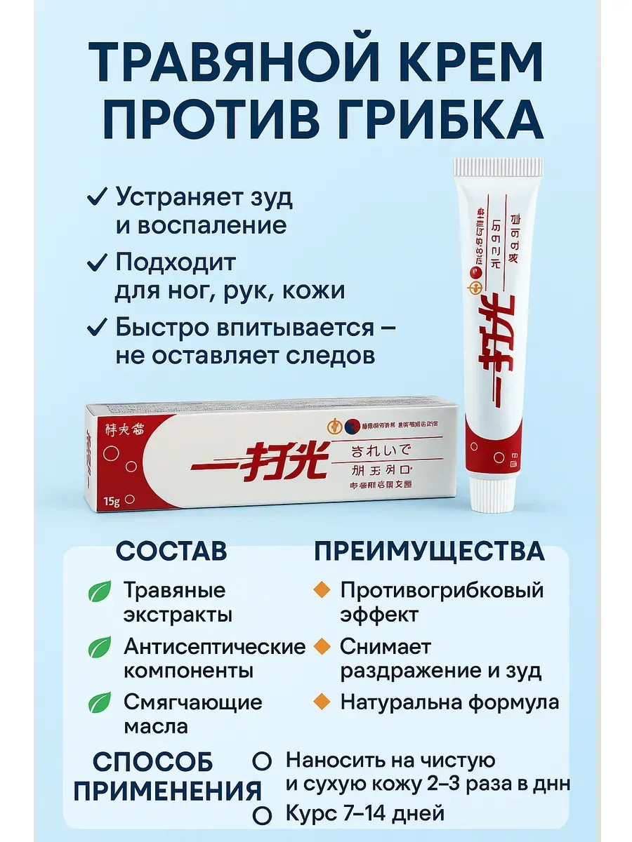 Травяной крем против грибка — эффективное средство для борьбы с грибковыми заболеваниями кожи. Благодаря натуральному составу, крем оказывает противовоспалительное, антисептическое и смягчающее действие. Идеально подходит для лечения грибка на ногах, руках, между пальцами и других участках тела. Быстро впитывается, не оставляя следов на одежде и коже.