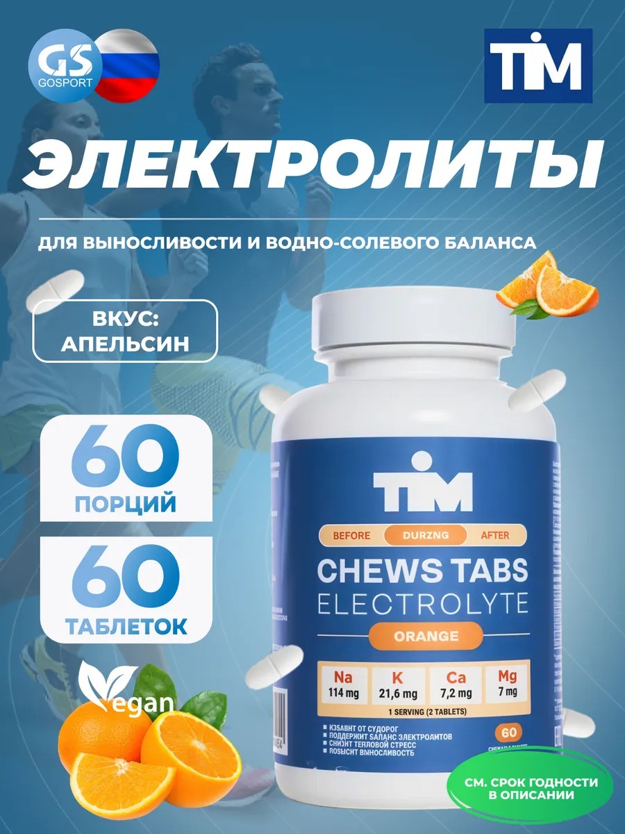 Годен до 25.07.2027. Электролиты Солевые таблетки "CHEWS TABS" 60 таблеток, Апельсин. - Новая, удобная форма для поддержания и восполнения электролитного баланса - жевательные таблетки TiM- Электролиты рекомендуются для питания спортсменов во время интенсивных тренировок в дополнение к основному рациону, чтобы восполнить запасы организма натрием, магнием, калием и кальцием.- Входящие в состав компоненты способствуют восстановлению запасов минеральных веществ в процессе физической активности, повышению уровня энергетического обмена и работоспособности организма, защите клеток организма от окислительного стресса, улучшению работы кровяных сосудов, нормальному функционированию мышц, включая сердечную, нормализации образования коллагена и поддержания нормального состояния костей.- Жевательные таблетки содержат микс углеводов с разным гликемическим индексом.- Разработан с учетом запроса спортсменов в том числе для удобства употребления продукции. Жевательные таблетки не требуется разводить в воде.• Не содержит запрещенных WADA веществРекомендации по применениюУпотреблять по одной таблетке каждые 45 минут. Принимать продукт в период интенсивных тренировок.