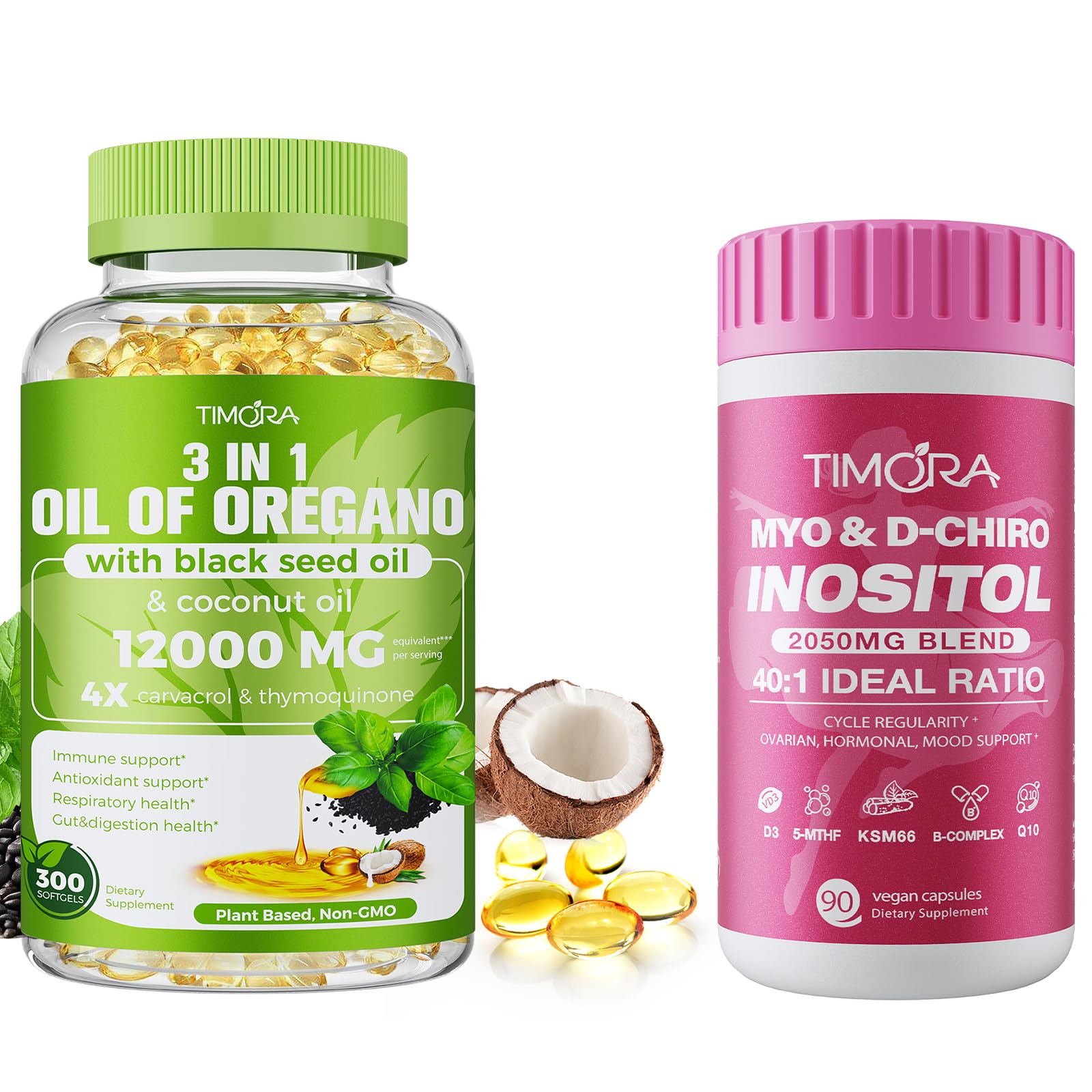 Introducing The Holistic Duo: Balance Your Core, Shield Your Wellness for Months Modern life demands a resilient foundation. Meet your new health allies: a two-part system designed to nurture your body's internal balance and natural defenses from the inside out, with one less thing to worry about thanks to our long-lasting supply. 1. TIMORA 40:1 Inositol Your Hormonal Harmony Partner (90 Capsules) Navigate the complexities of your cycle with confidence. Our advanced formula goes beyond basic inositol: The Gold Standard Ratio: The precise 40:1 blend of Myo and D-Chiro Inositol mirrors your body's natural composition, effectively supporting healthy ovarian function and menstrual cycle regularity. Beyond Balance: We integrated KSM-66, the highest-grade Ashwagandha, to help your body manage stress—a key factor in hormonal imbalance—promoting a calmer, more balanced mood. Cellular Energy Boost: Added CoQ10 addresses the fatigue often associated with hormonal challenges, supporting your daily energy levels. Clean Conscious: Vegan, gluten-free, and enriched with active Methylfolate and Vitamin D3 for a complete, pure approach to hormonal health. 2. TIMORA Triple Action Oregano Oil Your Long-Lasting Natural Defense Ally (300 Softgels) Fortify your wellness with the power of three renowned natural oils in one synergistic softgel, now in a generous 5-month supply: Oregano Oil: Celebrated for its potent, naturally occurring compounds that provide robust antioxidant support for overall well-being. Black Seed Oil: A treasured ingredient historically used to support a healthy immune response and overall vitality. Coconut Oil: A superior carrier oil that enhances bioavailability and offers its own supportive benefits. Synergistic Power Value: This trio works together to create a broader spectrum of support for your immune system. The large 300-count bottle offers exceptional value and convenience, ensuring consistent support. Why This Duo Works Better TogethePremium Quality Purity Guaranteed Both supplements are manufactured in the USA in cGMP-certified facilities. They are free from unnecessary fillers, artificial colors, and GMOs. We are committed to transparency and potency, so you can trust you're investing in high-quality ingredients for your health. Ultimate Convenience Unbeatable Value Simplify your routine with this curated bundle. The 300-count Oregano Oil provides long-lasting supply, reducing the need for frequent reorders. Potent Triple Action Oregano Oil Complex with 300 Softgels Experience the amplified benefits of a synergistic trio in a generous 5-month supply: Premium Oregano Oil for potent antioxidant properties, Black Seed Oil renowned for its immune-supporting compounds, and Coconut Oil as a beneficial carrier. This unique blend supports the body's natural defense system and overall vitality. Advanced 40:1 Inositol Formula for Hormonal Health Specifically crafted for women's hormonal needs. Features the optimal 40:1 ratio of Myo and D-Chiro Inositol, enhanced with KSM-66 Ashwagandha for stress support and CoQ10 for cellular energy. This clean, vegan formula supports PCOS management, promotes regular ovulation, and helps ease symptoms like irregular periods and mood swings. Complete Women's Wellness Defense System This expertly paired duo offers a holistic approach to health. The advanced Inositol supplement targets internal hormonal balance for cycle regularity, ovarian function, and mood, while the potent Triple Action Oregano Oil blend provides robust antioxidant and immune support, creating a powerful synergy for overall female well-being.