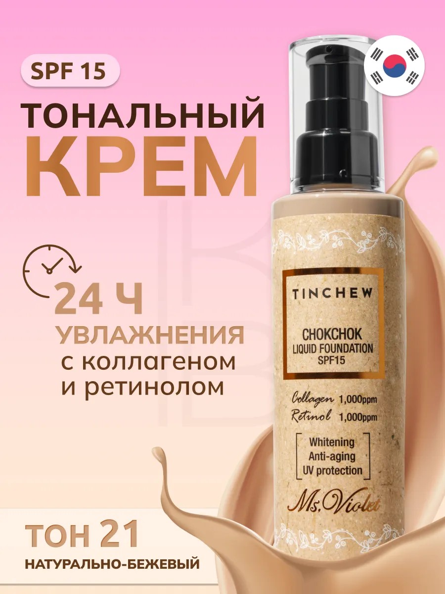 Тонирующий крем, в оттенке №21, наделен высокой пигментацией, благодаря которой маленькая капля средства покрывает большие участки кожи. Легкая текстура натурально-бежевого крема не ощущается на лице маской, обеспечивая идеальный, ровный тон и сияющую кожу. Tinchew увлажняющий тональный крем содержит в своем составе коллаген и ретинол, которые стимулируют активное восстановление клеток кожи, питают ее и избавляют от недостатков. Оригинальный тональный крем tinchew в короткие сроки поможет справиться не только с морщинами и неровным тоном кожи, но и прыщиками, черными точками и пигментными пятнами.