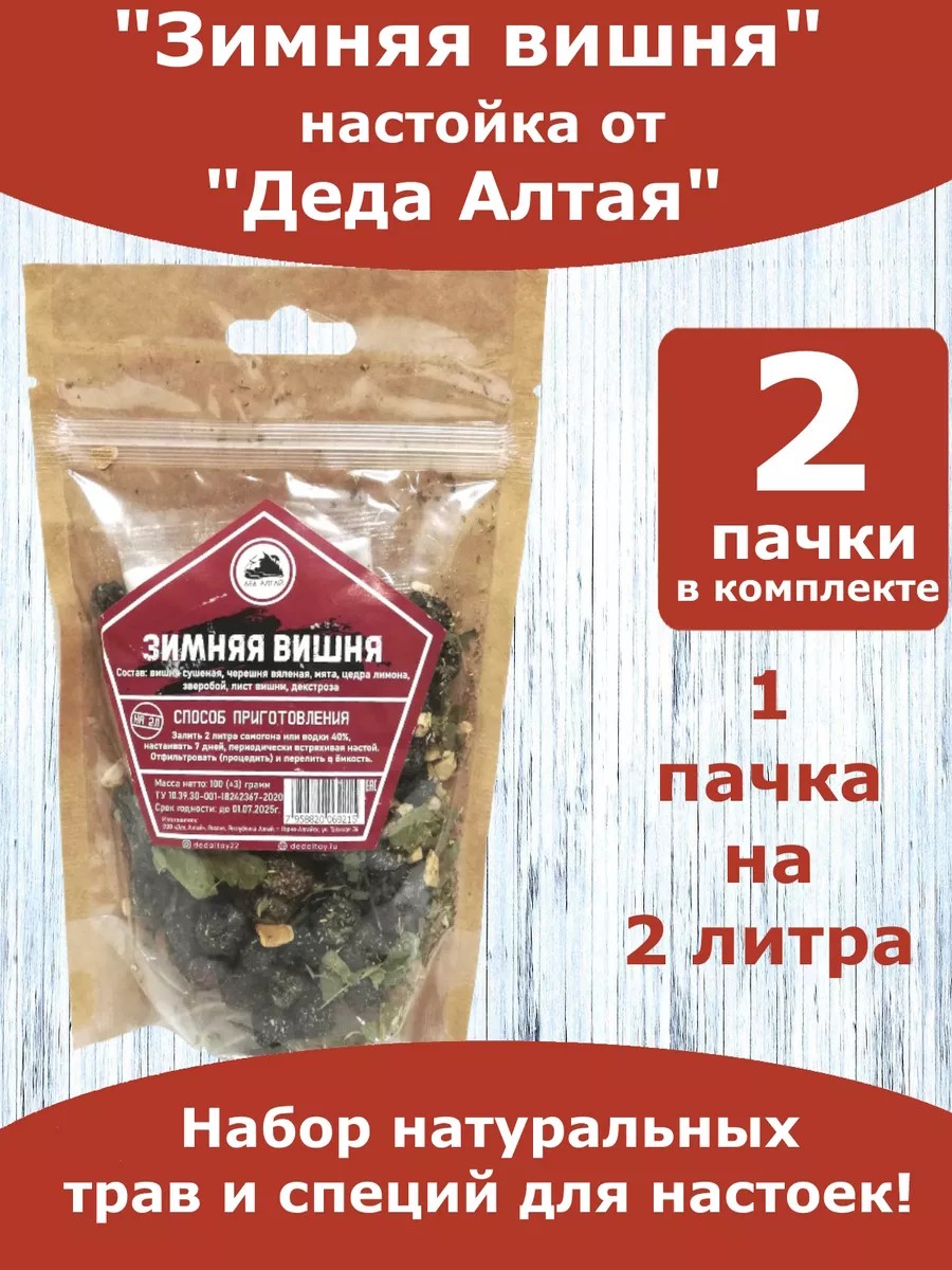 Настойка «Зимняя Вишня» на 2 литра для самогона, водки. Набор трав и специй для настаивания от компании "Дед Алтай".Зимняя вишня, прекрасных ягод аромат! И ведь действительно, аромат этой настойки, как в песне, потрясающий! Особую пикантность вишне придает мята перечная в составе. За счет ее эфирных масел напиток приобретает прохладное, свежее послевкусие. Легкие цитрусовые нотки прекрасно дополняют этот букет. За счет идеально сочетающихся ингредиентов: вишни, мяты и лимона, настойка получается мягкая, легкая и очень приятная. В комплекте с набором трав и специй находится фирменная наклейка для бутылки с готовым напитком и декстроза. Один набор рассчитан на 2 литра алкогольной основы (самогон, водка). В упаковке 3 набора. Дед Алтай это более 80 наборов для изготовления домашних настоек на водке или самогоне на любой вкус. Все травы собираются на Алтае и фасуются вручную.Наборы трав и специй от компании «Дед Алтай» состоят исключительно из натуральных ингредиентов без искусственных добавок и красителей. Они отлично подходят для настаивания домашнего алкоголя и позволят Вам получить вкусный напиток отменного качества!Состав: Вишня сушеная, черешня вяленая, мята, цедра лимона, зверобой, лист вишни, декстроза.Рецепт настойки для самогона "Зимняя Вишня": Залить набор двумя литрами самогона или водки. Настаивать 7 дней, периодически встряхивая. Процедить, дать отдохнуть 3 дня. Масса нетто: 100 грамм.