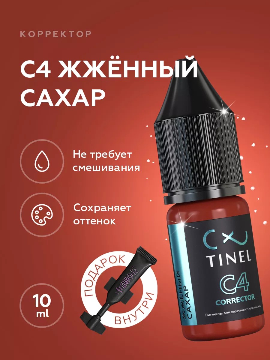 C4 “Жженый сахар” – красно-оранжевый цвет. Рекомендуется для добавления в основной черный пигмент при работе с веками (Е0, Е10). Используется для компенсации голубых и салатовых оттенков.