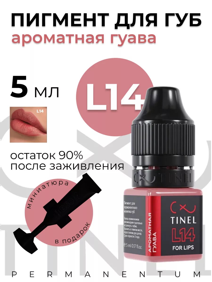 Tinel L14 Lip Tattoo Pigment, Fragrant Guava, 5 ml, permanent makeup pigment. Natural, pinkish-brown shade. Provides a natural color. Also suitable for permanent makeup of the areolas. Suitable for correcting asymmetry and blurred lip contours. Opaque. Application technique allows for a translucent to lipstick-like effect. Ready to use. Retains up to 100% of the pigment after healing. Supplied in a clear, square plastic bottle.