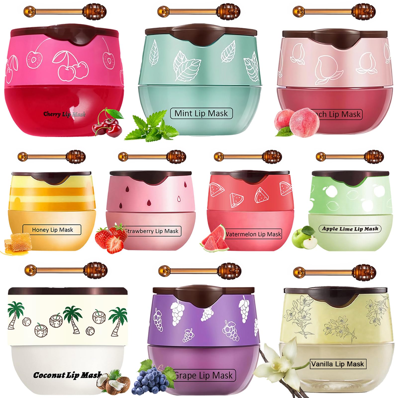 TIRDET 10 PCS Bee Lip Balm Honey Pot, Honey Coconut Cherry Peach Mint Grape Vanilla Strawberry Watermelon Apple, Lip Balm Bulk with Stick, Hydrating Lip Mask Overnight, Exfoliating Crack Scrubs