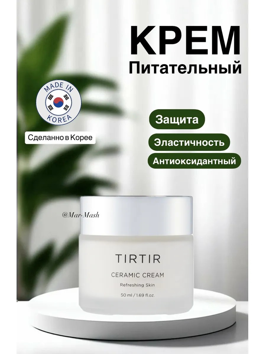 Питательный крем для лица TIRTIR Ceramic Cream 50 мл. прекрасно питает и увлажняет кожу, улучшая её внешний вид и омолаживая её изнутри, способствует выработке естественного коллагена в клетках кожи. Крем Корея направлен на устранение сухости и обезвоженности кожи, снятие раздражений и выравнивания общего тона кожи, замедление процессов увядания. Восстанавливающий крем для лица создает на коже защитный барьер, препятствующий негативному воздействию внешней среды (холод, жара, ветер, сухость воздуха). Это повышает местный иммунитет, укрепляет тонус кожи и замедляет процессы увядания. Состав увлажняющей сывортки также обогащен керамидами и маслом ши, которые оказывают мощное осветляющее и противовоспалительное действие на кожу. Керамиды в активной формуле крема выполняют строительную функцию, идентичные по своему строению с керамидами кожи, встраиваются в гидролипидный слой эпидермиса, равномерно заполняя межклеточное пространство и помогая удерживать влагу, и таким образом восполняют целостность кожного покрова. Средство имеет питательную текстуру баттера, хорошо распределяется и впитывается, наполняя кожный покров влагой и регулируя гидро-липидный баланс. Подходит для всех типов кожи. Особенно рекомендован для сухой и обезвоженной кожи. Не содержит вредных веществ: в состав не входят парабены, сульфаты, искусственные красители и ароматизаторы, спирт, минеральное масло и силикон, что делает его более благоприятным для кожи и безопасным для разных типов кожи.Способ применения: Нанесите необходимое количество крема на кожу и равномерно распределите по всему лицу. Слегка похлопайте, чтобы помочь впитаться.