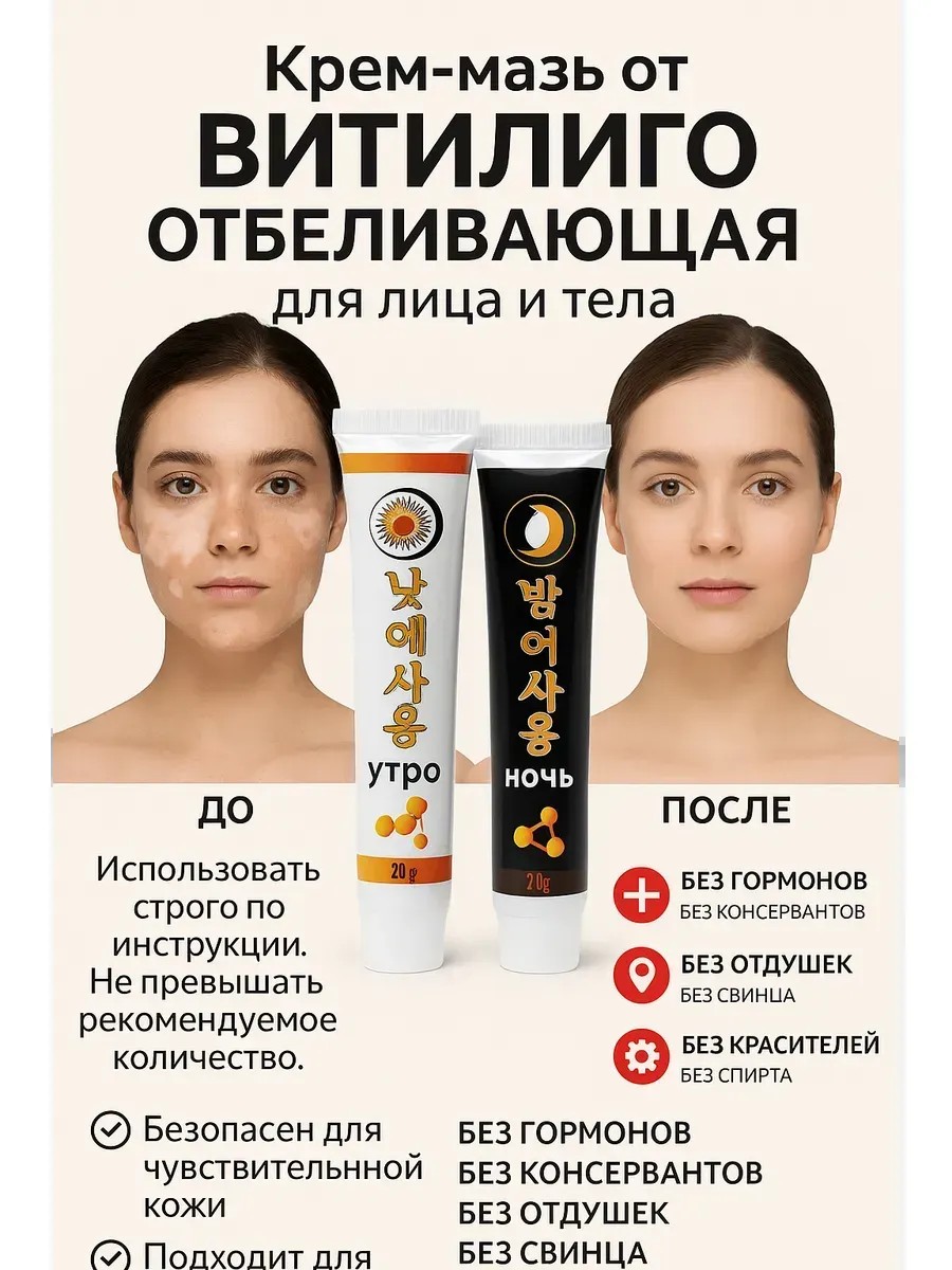 Ищете мазь от витилиго, которая действительно работает? Представляем вам уникальный комплекс — дневной и ночной крем от витилиго, созданный по современным технологиям совместно с фармацевтическими компаниями из Южной Кореи и Китая. Это средство помогает в лечении витилиго и восстановлении естественного цвета кожи.