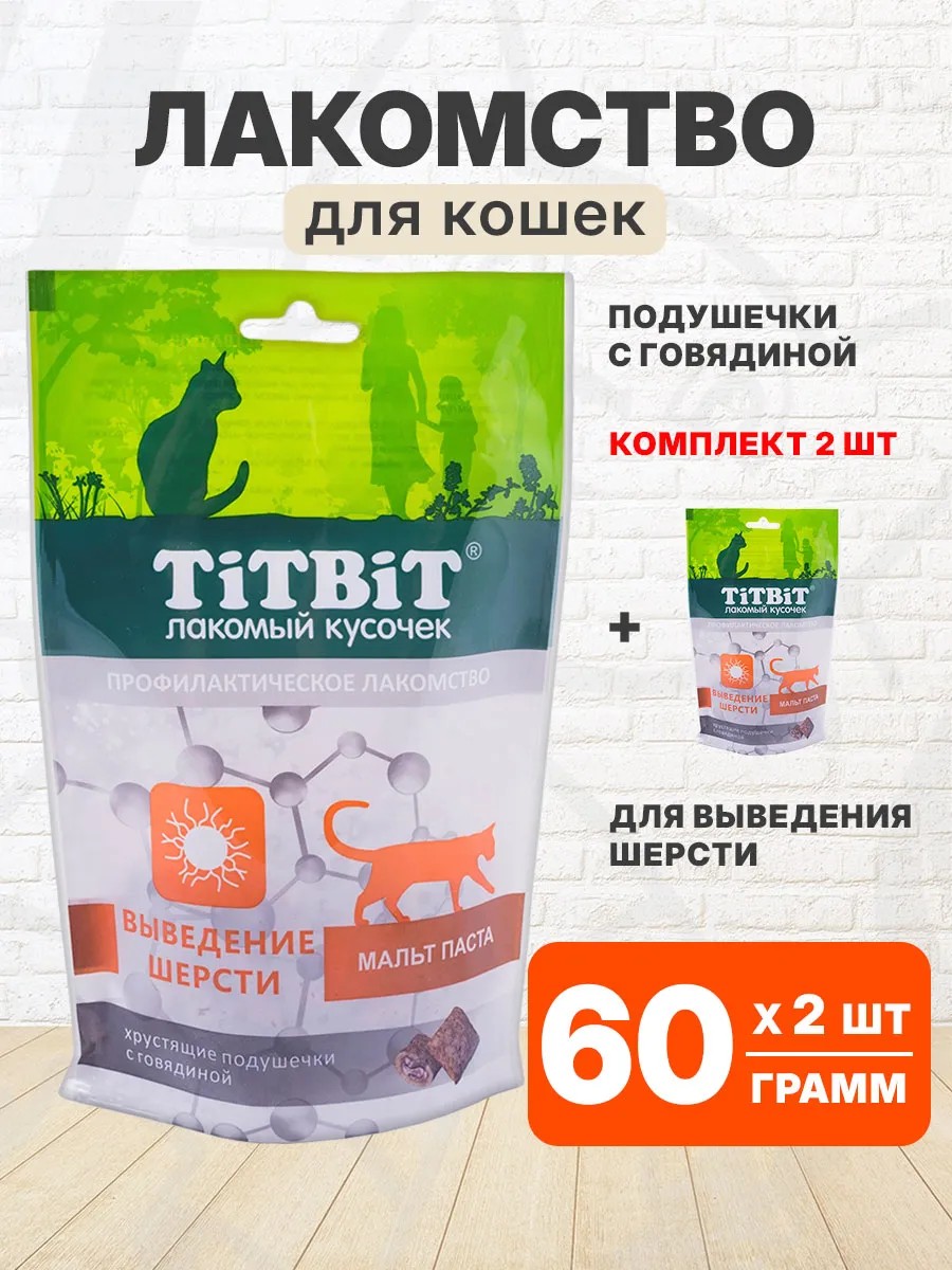| Комплектация | Лакомство для кошек хрустящие подушечки с говядиной для выведения шерсти пакет 60 г 2 шт |
