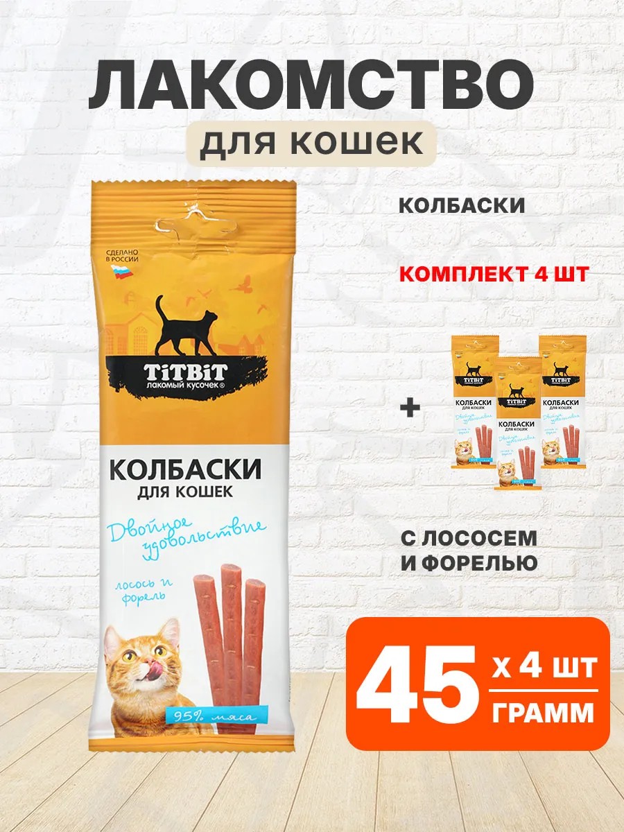 | Комплектация | Лакомство колбаски для кошек с лососем и форелью набор 45 г - 4 шт |