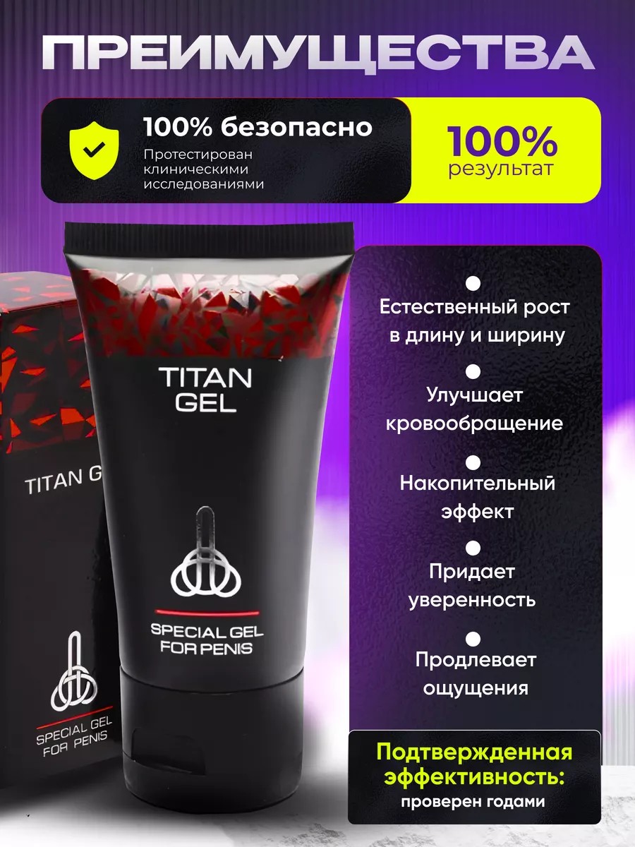 Крем-гель «Титан Гель» предназначен для увеличения мужской силы в домашних условиях. Позволяет быстро и безболезненно достичь желаемых показателей в длину и в диаметре. Имеет ряд таких преимуществ, как обеспечение мощности и контроля во время близости, а также поднятие и восстановление желания.
