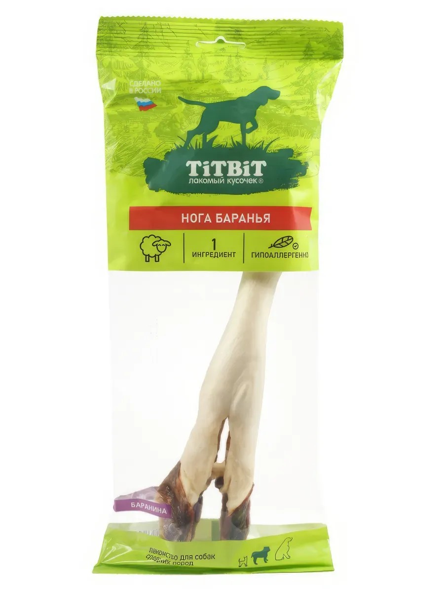 TiTBiT Leg of Lamb Treat for Dogs, 85g. Leg of lamb with hoof. Contains 1 dried leg of lamb. Hypoallergenic protein, high content of cartilage and connective tissue. Contains skin, lots of bone, fat, collagenous connective tissue, and only a few layers of muscle tissue. Massages gums and strengthens chewing muscles, cleans plaque, and prevents tartar buildup. A wonderful toy that keeps home furnishings and personal items safe. This treat contains a tubular bone and is not intended for complete consumption. Once the dog has eaten the skin, tendons, and muscle sheath, replace the treat with a new one.