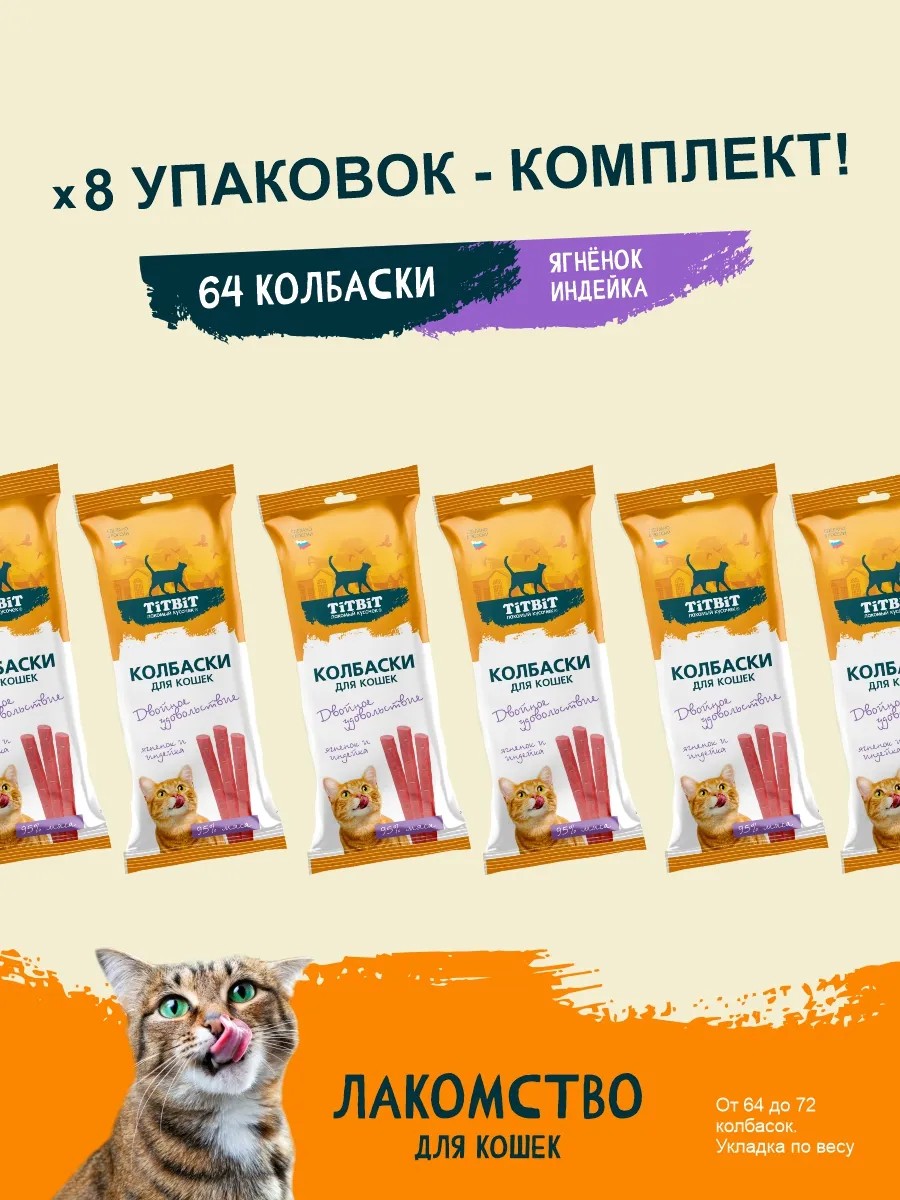 Комплект колбасок для кошек с ягненком, индейкой 45г х 8уп