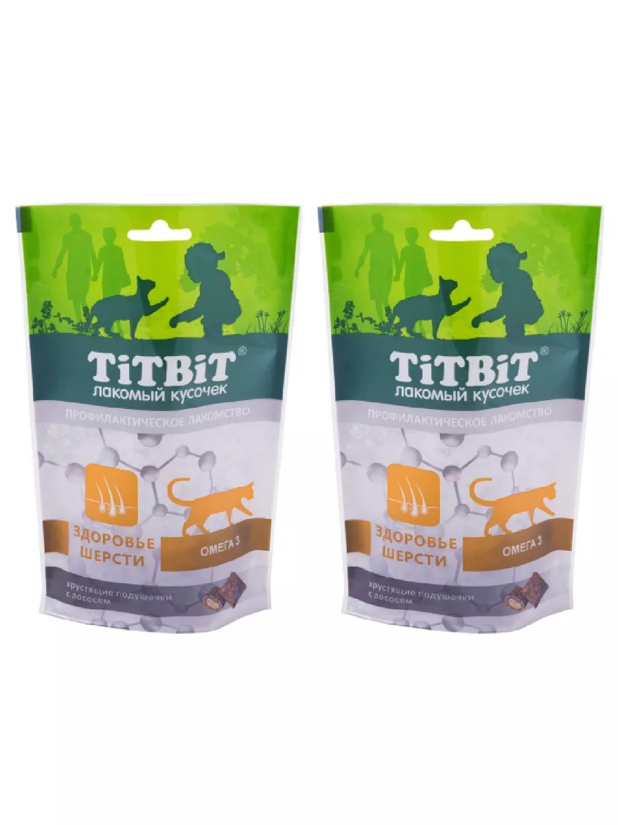 TiTBiT Cat Treats: Crunchy Salmon Pads for a Healthy Coat, 60 g, 2 pcs. TiTBiT preventative cat treats are specially formulated, healthy treats to support your pet's health. These crunchy salmon pads for cats with a healthy coat contain Omega-3 fatty acids and vitamins, which stimulate coat growth and shine, promoting rapid recovery after shedding.