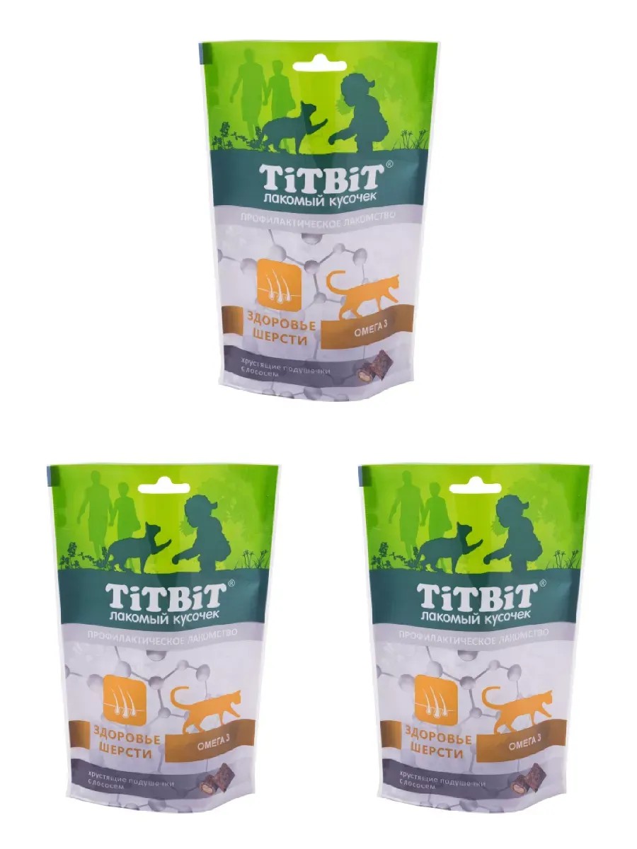 TiTBiT Cat Treats: Crunchy Salmon Pads for a Healthy Coat, 60 g, 3 pcs. TiTBiT preventative cat treats are specially formulated, healthy treats to support your pet's health. These crunchy salmon pads for cats with a healthy coat contain Omega-3 fatty acids and vitamins, which stimulate coat growth and shine, promoting rapid recovery after shedding.