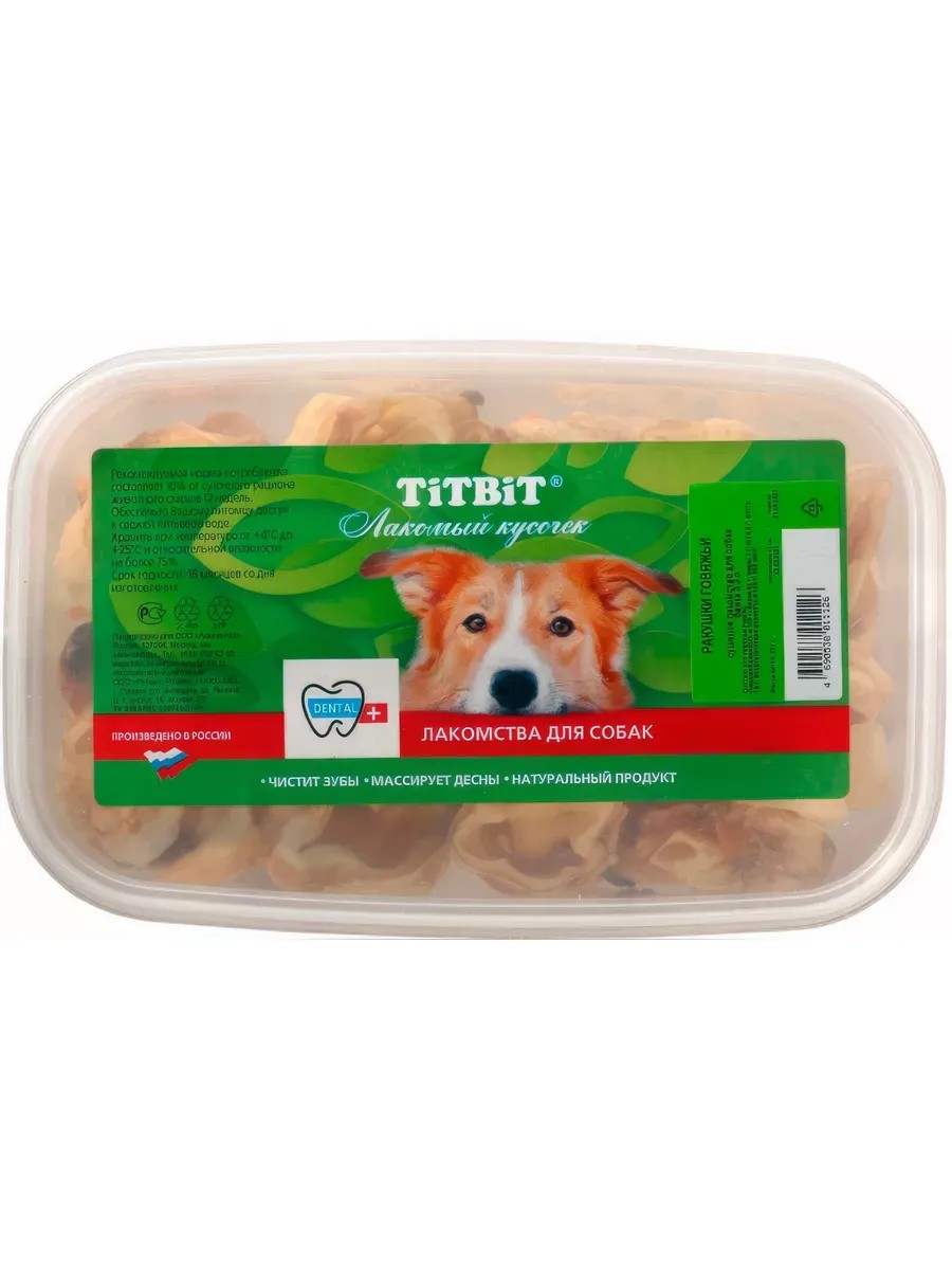 TiTBiT Dog Treats, Beef Ear Shells, Plastic Jar, 3.3 L. The package contains dried cartilaginous bases of beef ears. The high content of collagen and elastin fibers provides the body with essential components for the growth and maintenance of the quality of cartilaginous tissue of your pet's joints. Recommended to facilitate the change of teeth in puppies, strengthen gums, clean teeth from plaque and tartar, additional nutrition and strengthen the cartilaginous tissue of middle-aged and older dogs. The high content of collagen and elastin helps improve the formation of ear cartilage in dog breeds whose standard requires an upright position of the auricle. Ingredients: beef ear (part). Nutritional value per 100 g: proteins 80 g, fats 7 g, ash 2 g, moisture 10 g. Energy value per 100 g: 388 kcal. Shelf life (months): 18 Storage conditions: Store at a temperature of +4°C to +25°C and a relative humidity of no more than 75%.