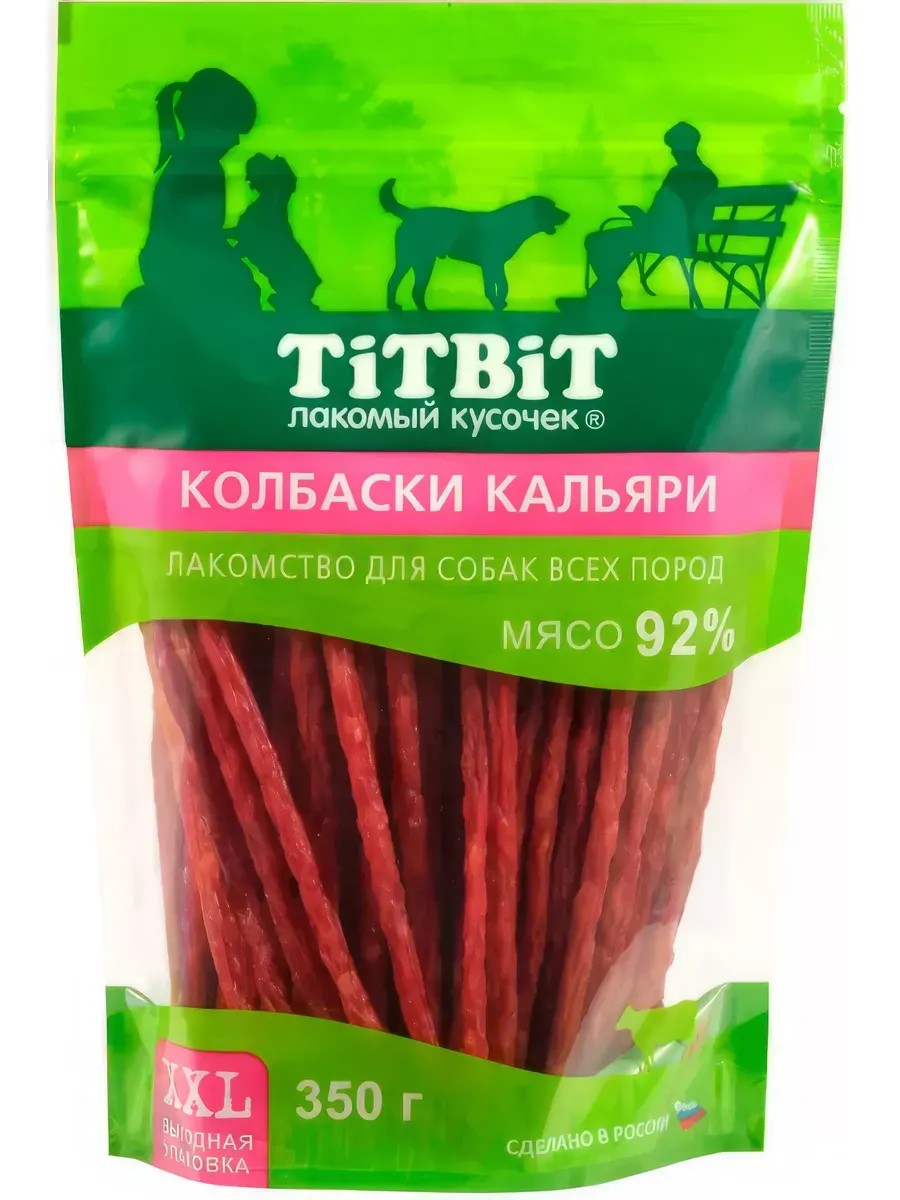 TiTBiT treats for dogs of all breeds, Cagliari sausages, XXL, advantageous packaging, 350 g. Cagliari sausages are a delicious treat for dogs of all breeds. Thanks to the high meat content (92%) and gentle cooking technology, they have an attractive appearance and taste. The meat and by-products used in the sausages are an excellent source of high-quality animal protein, vitamins, and minerals. Advantageous XXL packaging with a convenient zip-lock will preserve the treat and prolong your pet's enjoyment. Ingredients: meat and by-products (beef 92%), vegetable oils, thyme, marjoram, minerals, mixed tocopherols, and rosemary extract. Nutritional value per 100 g: protein 60 g, fat 16.5 g, ash 5.5 g, moisture 18 g. Energy value per 100 g: 389 kcal. Shelf life (months): 12 Storage conditions: Store at a temperature of +4°C to +25°C and a relative humidity of no more than 75%.