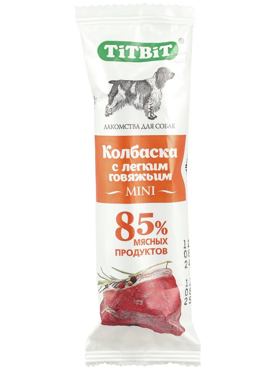 TiTBiT dog treat sausage with beef lung, 20 g. Lungs are very tasty, low in calories, and easily digestible. They contain almost the same set of vitamins as meat, but are much less fatty. They have a positive effect on the condition of the skin, coat, and overall metabolism. Ingredients: meat and meat by-products (more than 85%), corn, minerals. Energy value: per 100 g: proteins 60.2 g, fats 11.4 g, ash 3.5 g, moisture 8.7 g, 438 kcal.