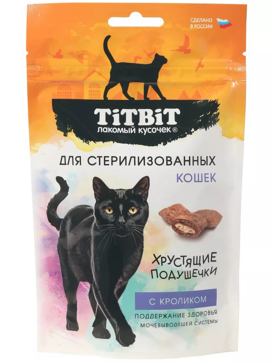 Treat Pads for Sterilized Cats, Rabbit, 60g. TiTBiT Treat Pads for Sterilized Cats, Crunchy, for Urinary Tract Health, with Rabbit, 60g. These crunchy pads are the perfect treat for your spayed cat! Now you can pamper your pet and care for their health. The composition of these pads is designed with the physiological characteristics of spayed and neutered cats in mind. Functional ingredients have been added to support urinary tract health: cranberry protects against urinary tract infections and regulates urine acidity; DL methionine helps break down fats and reduces the formation of phosphate salts, which, when accumulated, can lead to the development of urolithiasis in pets. Ingredients: Cereals, meat and by-products (including 15% rabbit meat), animal oils and fats, egg powder, yeast, milk powder, cranberries, minerals and vitamins. Added substances: vitamin D3 630 IU, vitamin E 90 mg/kg, DL methionine 500 mg/kg, taurine 1000 mg/kg. Energy value per 100 g: 367 kcal. Proteins 19 g, fats 15 g, ash 4.5 g, moisture 11 g.