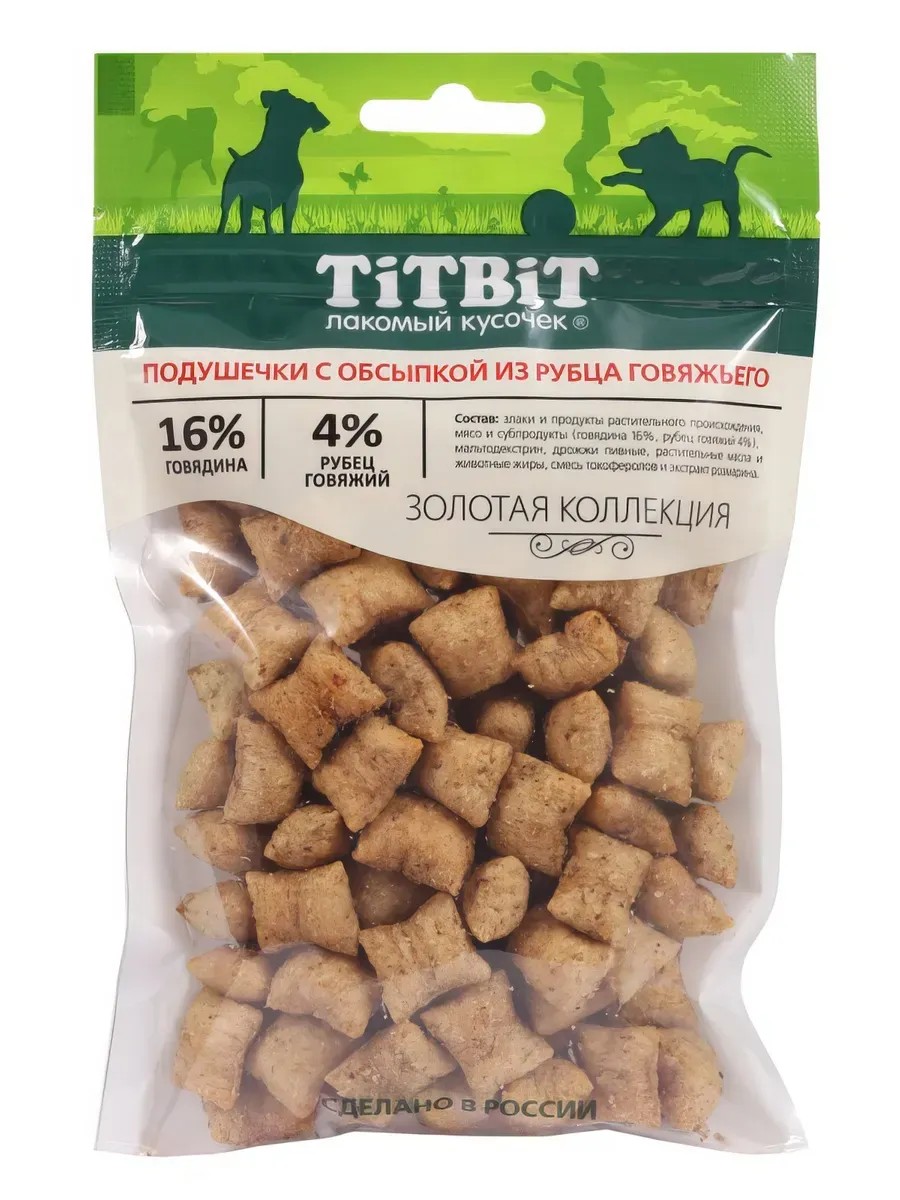 Лакомство TiTBiT подушечки с обсыпкой из говяжьего рубца для собак, 80 г. Лакомство TiTBiT подушечки с обсыпкой из говяжьего рубца для собак, 80 г Золотая коллекция это линейка лучших лакомств TITBIT, разработанных при участии владельцев домашних животных и их питомцев. Подушечки с начинкой это аппетитные лакомства, которые, благодаря нежной начинке и уникальному верхнему слою, имеют привлекательный внешний вид и невероятный вкус. Хрустящие подушечки в обсыпке из рубца говяжьего, который обогащает организм ферментами и витаминами группы В . Полезная и вкусная мясная обсыпка понравится даже самому привередливому питомцу.