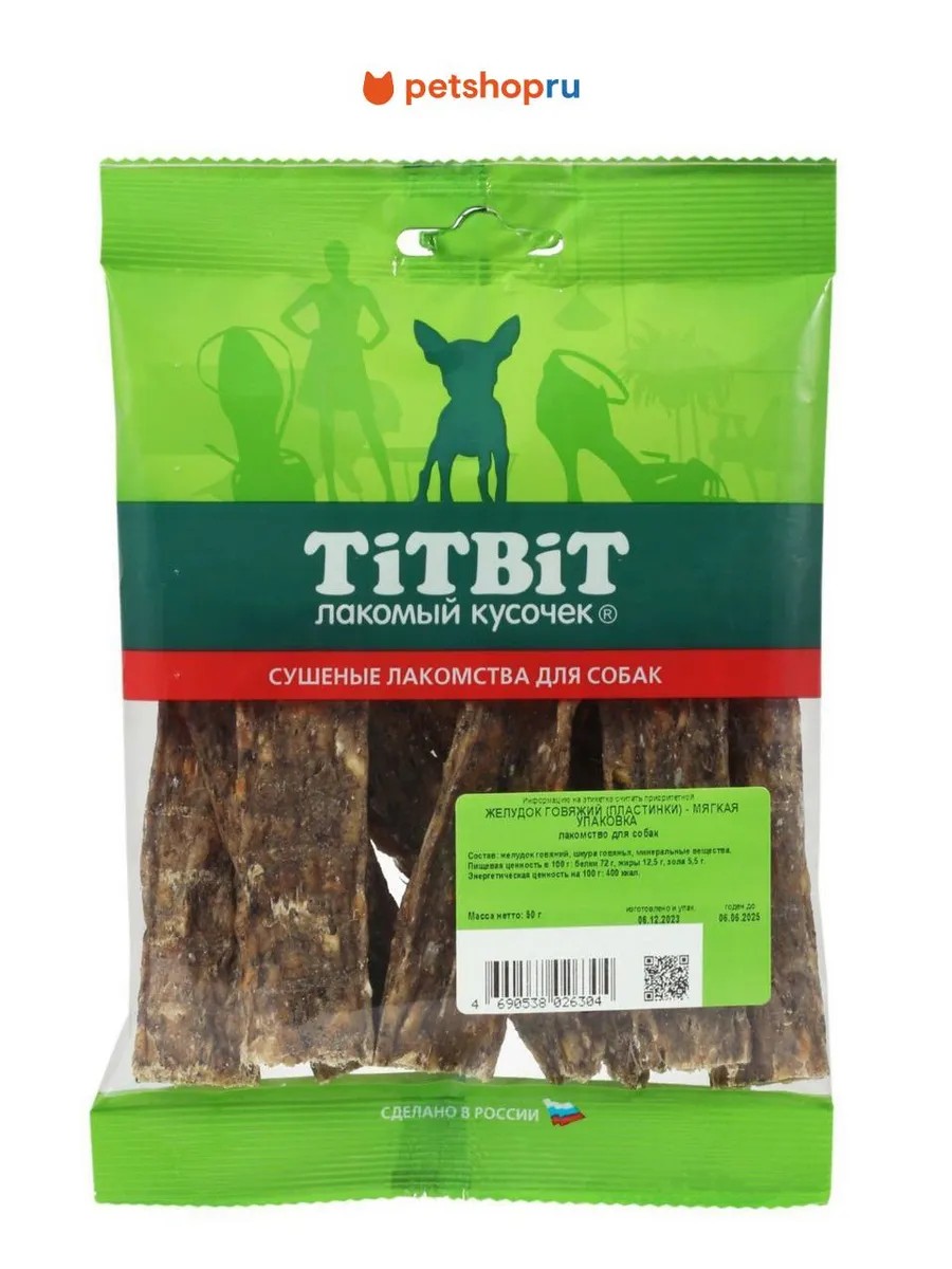 Dried beef stomach slices. Each package contains 9-11 slices, each 9 cm long. Beef stomach contains a large amount of enzymes, B vitamins, and beneficial microorganisms. Consuming this product helps improve your pet's microflora. This treat is made from natural by-products, dried using a special technology that preserves all the beneficial properties.
