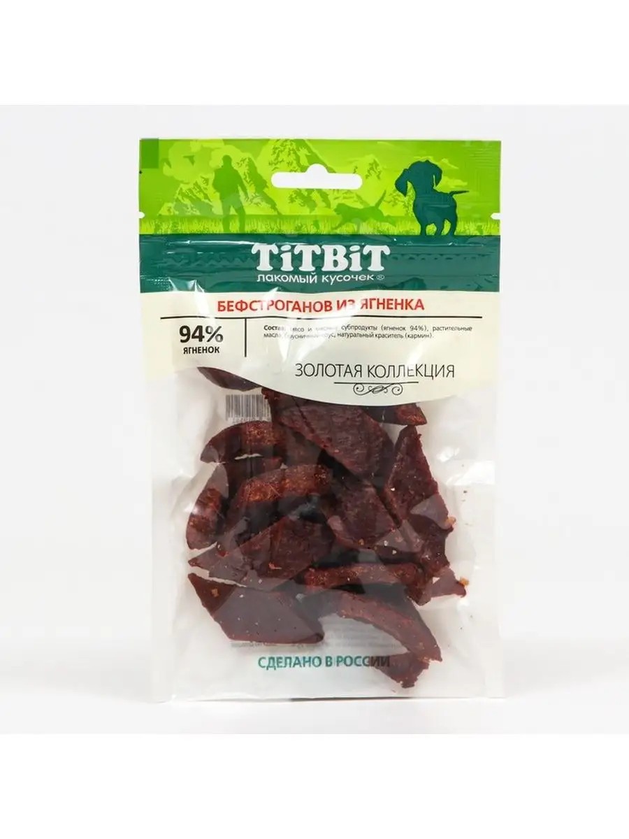 Titbit Beef Stroganoff Lamb Dog Treats "Golden Collection", 75g. TiTBiT's Golden Collection Treats are a line of meat treats developed with the input of pet owners and their pets. Beef Stroganoff dog treats are a meat delicacy made from lamb with the addition of lingonberry sauce, which adds a sophisticated touch to the delicate flavor. No gourmet can resist such a delicacy. Lamb, the base of this treat, is a dietary source of high-quality animal protein, B vitamins, and minerals: Ca (calcium), P (phosphorus), Zn (zinc). Convenient packaging with a zip-lock fastener will preserve the taste and aroma of the treat for a long time. Treats are a supplement to nutrition and do not replace daily full feeding. Please leave a bowl of fresh drinking water for your pet. Nutritional value per 100g: protein 59g, fat 17g, ash 5g, moisture 17g. Energy value per 100g: 397 kcal. TiTBiT treats are produced exclusively in Russia, using high-quality ingredients supplied by Russian farms. We are the choice of 8,000,000 caring owners. Our production is certified according to the international HACCP ISO 22000:2005 food safety standard.