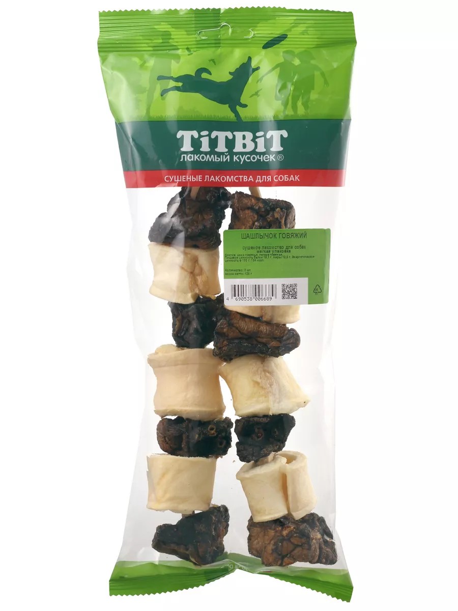 Baked pieces of dried beef lung alternate with beef hide rolls, skewered on edible leather strips. Two pieces per package. Thanks to its high amino acid and collagen content, it has a positive effect on cartilage tissue, skin, and coat condition, and also provides essential components for the growth and maintenance of cartilage in dogs' joints. The high content of trace elements and connective tissue enhances the dog's enjoyment of this delicate treat. Directions for use: Helps remove tartar. Promotes jaw development.