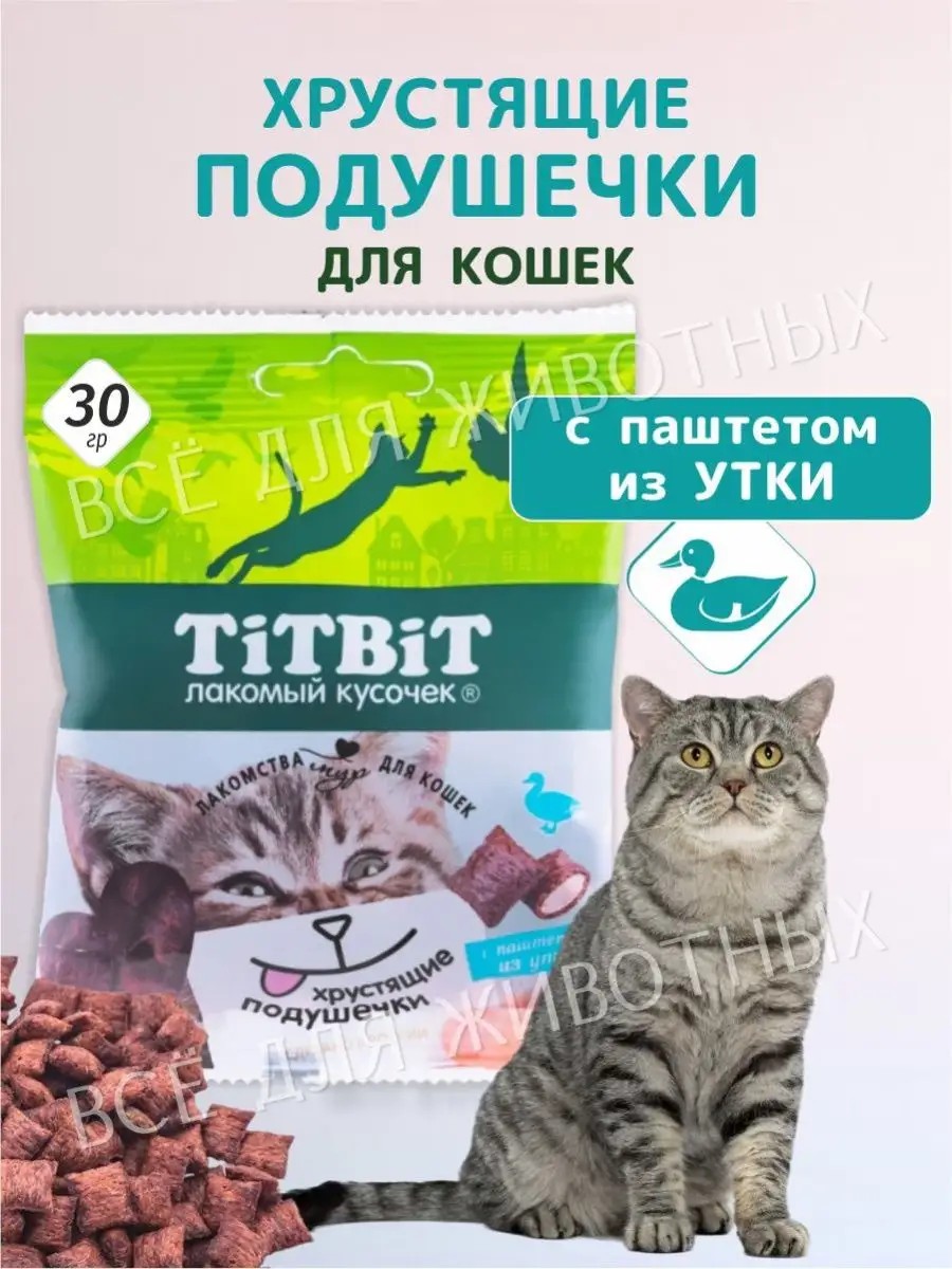Хрустящие подушечки для кошек с паштетом из мяса утки – это вкусное и полезное лакомство. Паштет, содержащийся внутри каждой подушечки, имеет мягкую однородную консистенцию в виде мусса и неповторимый нежный вкус. Благодаря бережной технологии изготовления паштета, удалось сохранить полезные свойства мяса, поэтому лакомство богато ценным белком, важнейшими минералами и витаминами.