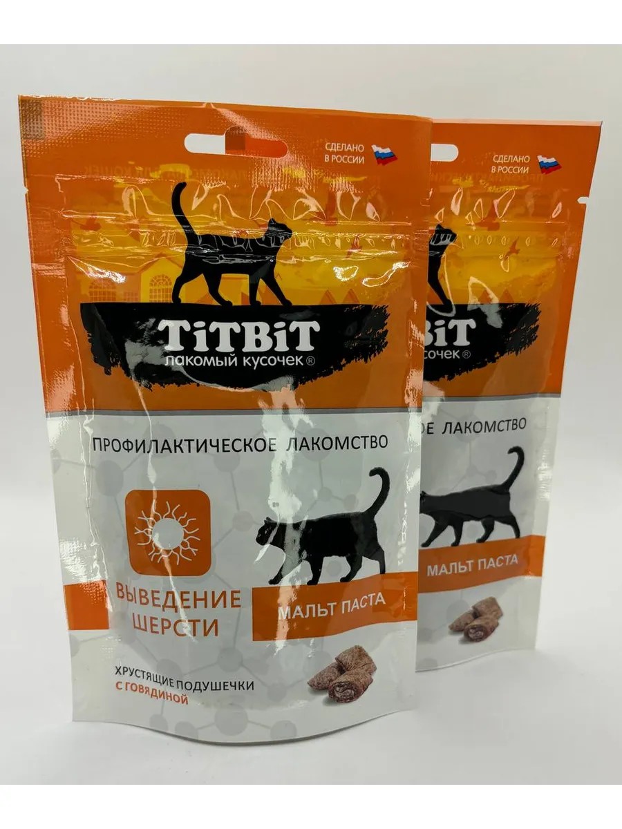 2 уп по 60 гр. Профилактические лакомства для кошек TiTBiT - специально разработанные полезные угощения для поддержания здоровья животного. Хрустящие подушечки для кошек с говядиной для выведения шерсти, содержат в составе мальт-пасту, которая способствует выведению шерсти из желудочно-кишечного тракта естественным путём.В наборе 2 уп по 60 гр.Состав: злаки, мясо и мясные субпродукты( в том числе говядина 15 %), животные масла и жиры( в том чиле 5% лососевое масло),растительное масло,сухое молоко,дрожжи ,минералы и витамины.