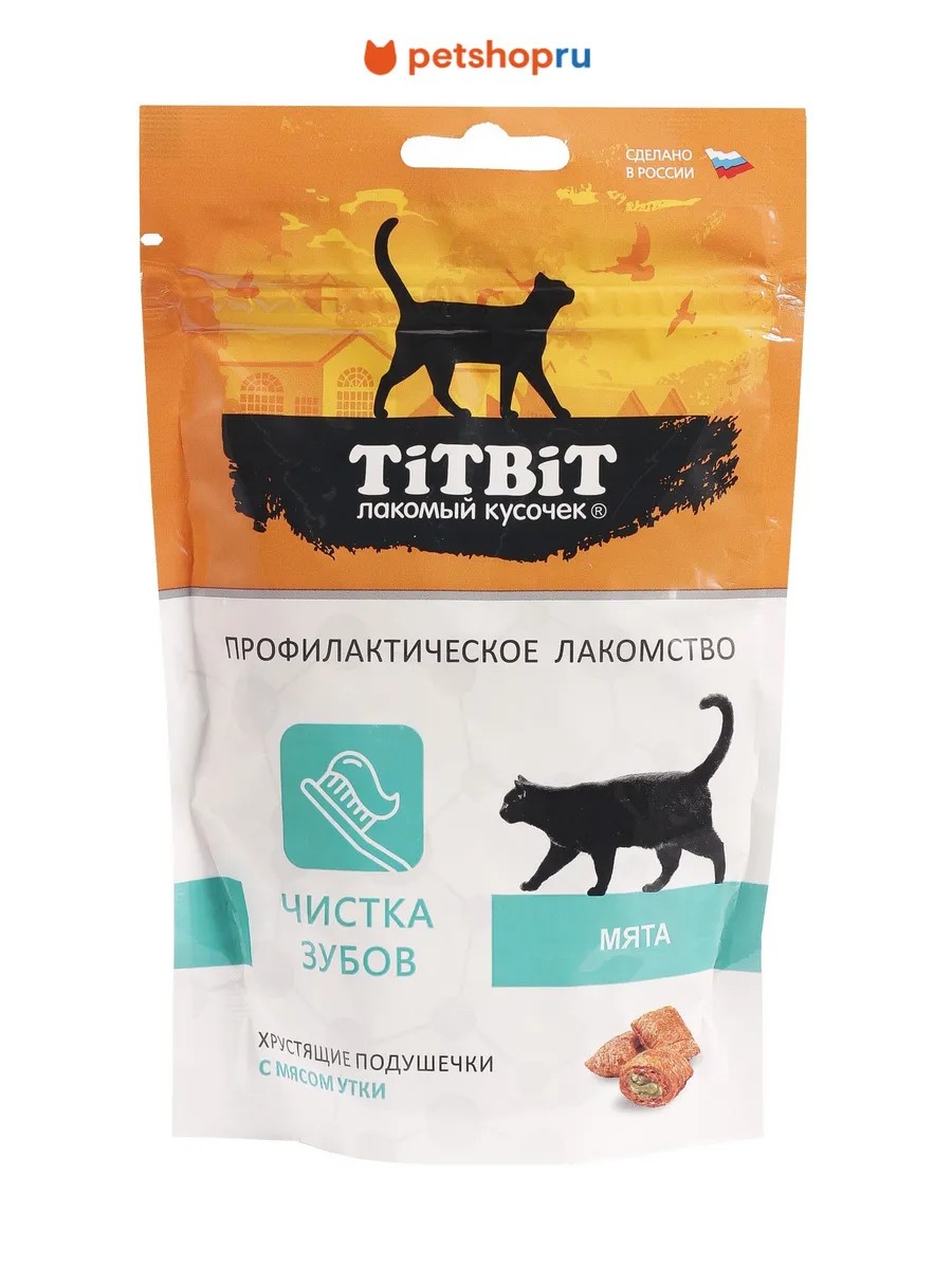 Профилактические лакомства для кошек TiTBiT - специально разработанные полезные угощения для поддержания здоровья животного. Хрустящие подушечки для кошек с мясом утки для чистки зубов, содержат в составе мяту, которая способствует устранению неприятного запаха изо рта, а твердая текстура оболочки очищает зубы от налета, предотвращая образования зубного камня.