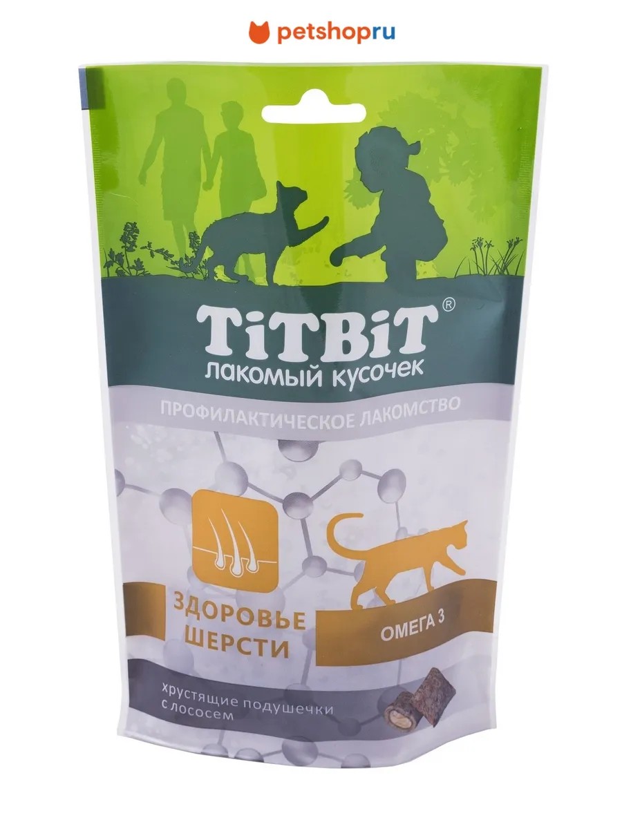 Профилактические лакомства для кошек TiTBiT - специально разработанные полезные угощения для поддержания здоровья животного. Хрустящие подушечки для кошек с лососем для здоровья шерсти, содержат в составе Омега 3 жирные кислоты и витамины, которые стимулируют рост и блеск шерсти, способствуют быстрому восстановлению животного после линьки.