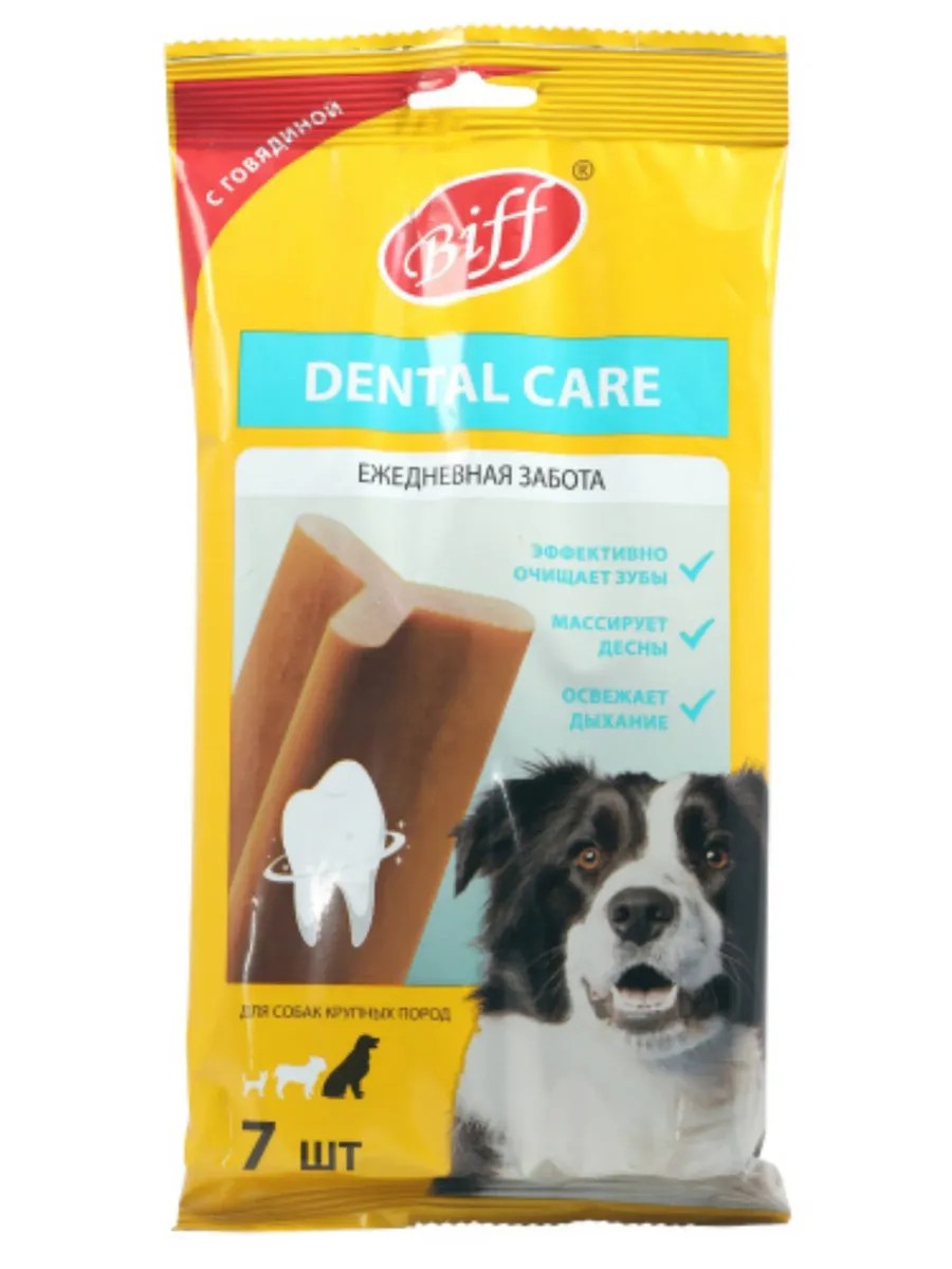 Biff Dental Care - это жевательный снек, необходимый для ежедневного ухода за ротовой полостью собак. Особая текстура и форма способствуют эффективному снятию мягкого зубного налета, снижению риска образования зубного камня и массажу десен. Фитокомплекс экстрактов растений предотвращает размножение вредных бактерий и освежает дыхание.