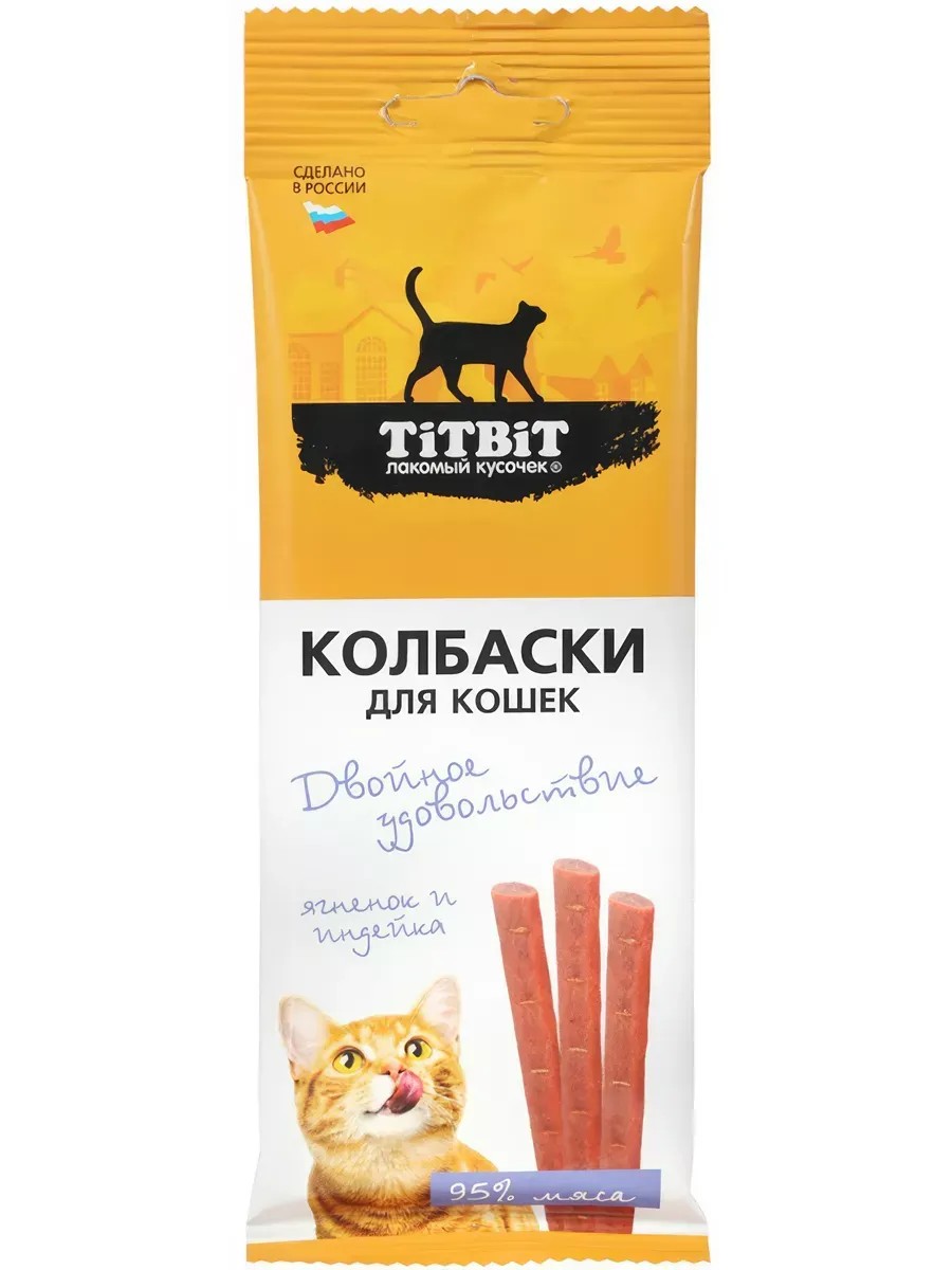 Treat Sausages for cats, with lamb and turkey, 45 g. TiTBiT Treat Sausages Double pleasure for cats, with lamb and turkey, 45 g. Sausages for cats Double pleasure are sausages that, thanks to the combination of double flavor, cats love twice as much. Ingredients: meat and meat by-products (including lamb - 8%, turkey - 8%), vegetable oils, rice flour, minerals, antioxidants, preservatives, natural coloring carmine. Energy value per 100 g: 373 kcal. Proteins 56 g, fats 13 g, fiber 3 g, ash 5 g, moisture 15 g.