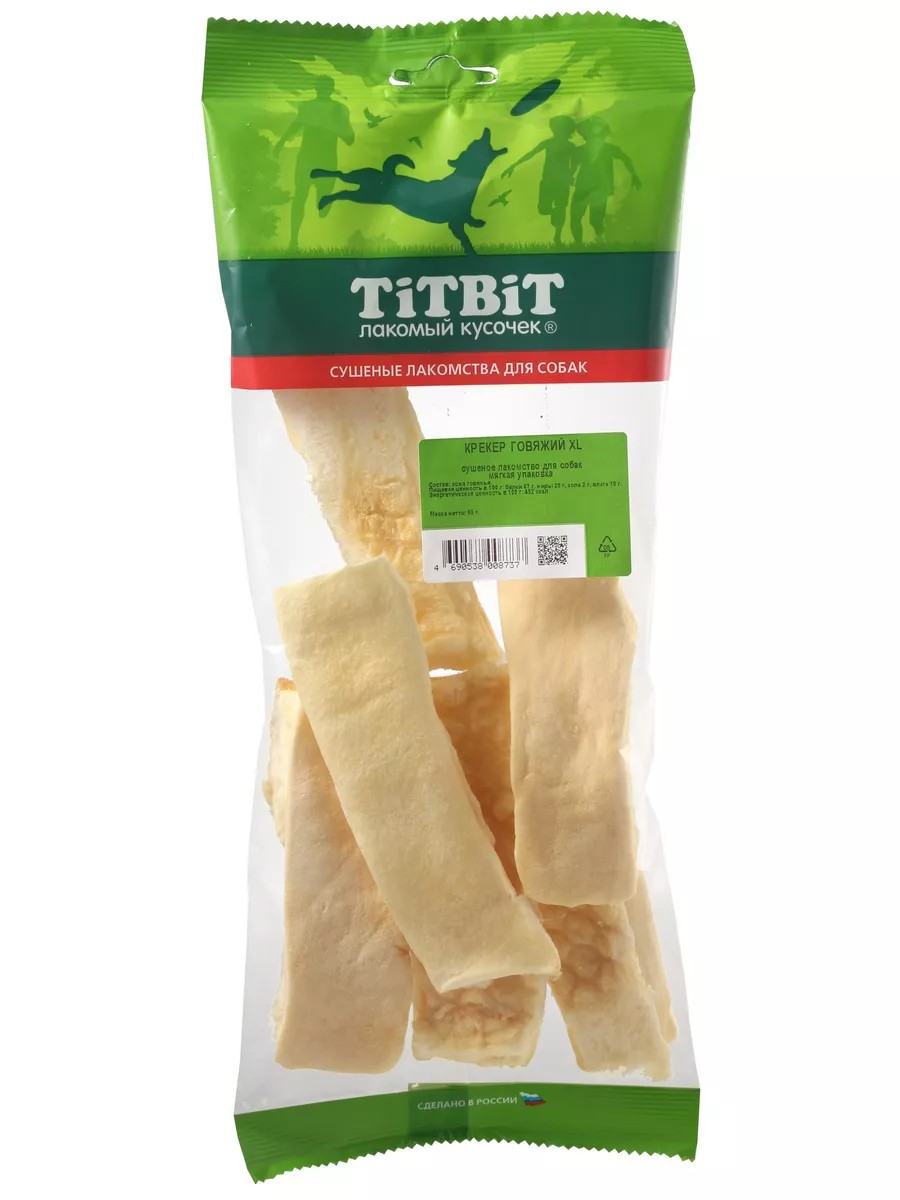 Сушеное лакомство для собак TiTBiT Крекер говяжий XL мягкая упаковка 70г.Благодаря большому содержанию аминокислот и коллагена положительно воздействует на хрящевую ткань, состояние кожи и шерсти собаки. Благодаря волокнистой структуре являются своеобразной зубной щёткой, способствующей укреплению дёсен, удалению зубного налёта и профилактике образования зубного камня.Рекомендуемая норма потребления составляет 10% от суточного рациона животного старше 12 недель. Обеспечьте Вашему питомцу доступ к свежей питьевой воде.