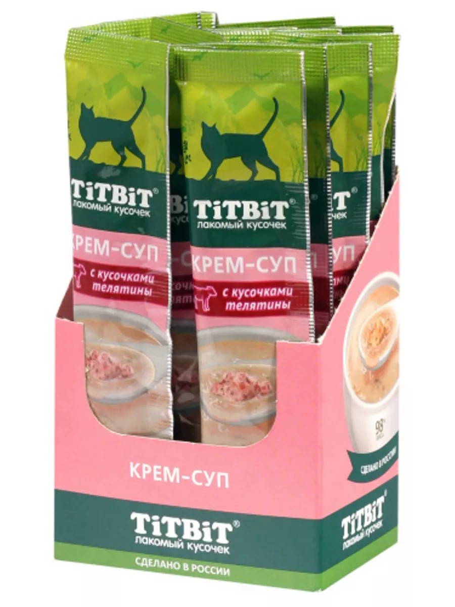 Крем-суп для кошек TITBIT – это специально разработанные вкусные и полезные продукты, которые: 1. Содержат кусочки свежего мяса; 2. Содержат 98% мясных ингредиентов; 3. Содержат дополнительные полезные ингредиенты (таурин для поддержки зрения, сердца, пищеварительной, половой и иммунной систем; морковь для поддержки зрения и пищеварения; петрушка для поддержки мочеполовой, сердечно-сосудистой и пищеварительной систем).