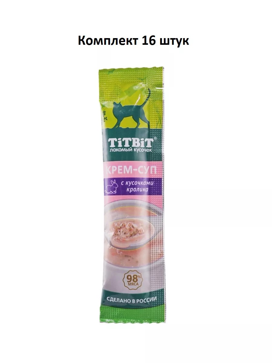 TiTBiT Лакомство крем-суп для кошек с кусочками кролика, 10 г, 16 шт. Крем-суп для кошек TITBIT – это специально разработанные вкусные и полезные продукты, которые: 1. Содержат кусочки свежего мяса; 2. Содержат 98% мясных ингредиентов; 3. Содержат дополнительные полезные ингредиенты (таурин для поддержки зрения, сердца, пищеварительной, половой и иммунной систем; морковь для поддержки зрения и пищеварения; петрушка для поддержки мочеполовой, сердечно-сосудистой и пищеварительной систем).
