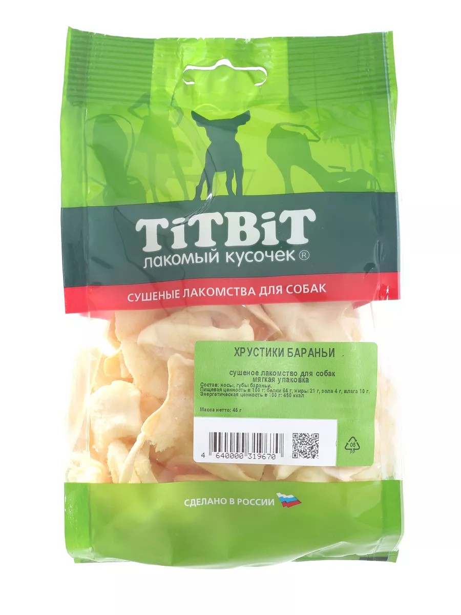 Dried pieces of lamb nasolabial folds and cheeks. Each package contains 14-16 pieces of treats. The high collagen and elastin fiber content provides essential components for the growth and maintenance of cartilage in your pet's joints. Contains hypoallergenic protein. The high collagen and elastin content helps improve the formation of ear cartilage (for dog breeds with upright ears).
