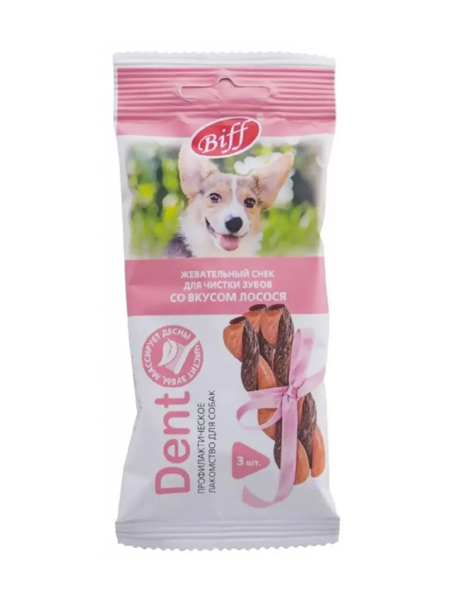 Biff "DENT" salmon flavor is a chewable snack for dogs. Its specially designed shape and texture help remove soft plaque, reduce tartar, and massage gums. It's also used as a treat and reward. Recommended for small breed dogs. Store at temperatures from +4°C to +25°C and relative humidity no more than 75%.