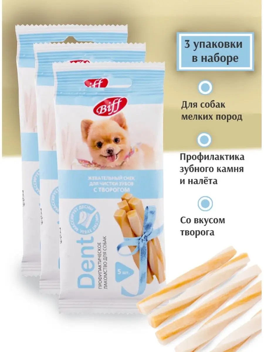 В наборе 3 уп, в 1 уп - 5 шт.1 уп - 30 гр. Biff «DENT» с творогом – это жевательный снек для собак, необходимый для снятия мягкого зубного налёта, снижения уровня зубного камня и массажа дёсен за счет специально разработанной формы и текстуры, используется в качестве лакомства и поощрения. Рекомендуется для собак миниатюрных пород.