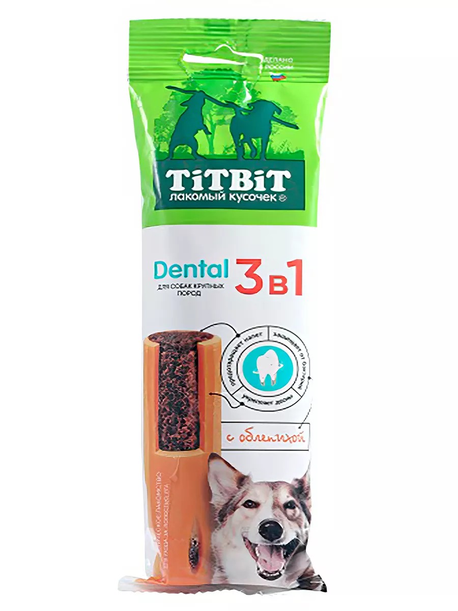 TiTBiT Dental 3 in 1 Treat for Large Breed Dogs with Sea Buckthorn, 95 g TiTBiT Dental 3 in 1 Treat for Large Breed Dogs with Sea Buckthorn, 95 g Denta l 3 in 1 is a preventative treat for comprehensive care of dogs' teeth and gums. Thanks to the combined texture and useful additives, the use of this snack will help maintain the health of the animal's oral cavity in excellent condition: the outer smooth layer provides massage and strengthens the gums; the inner porous layer prevents plaque formation; sea buckthorn - helps protect against bacteria. Ingredients: cereals, meat and by-products (including beef), vegetable oil, sea buckthorn, beet fiber, lecithin, hydrolyzed beef liver, minerals, whey, natural colors. 100 g of product contains: proteins 6.7 g, fats 3.4 g, ash 2.5 g, fiber 7 g, moisture 12 g. Energy value per 100 g: 296 kcal. Shelf life: 12 months. Storage conditions: Store at a temperature of +4?C to +25?C and a relative humidity of no more than 75%.