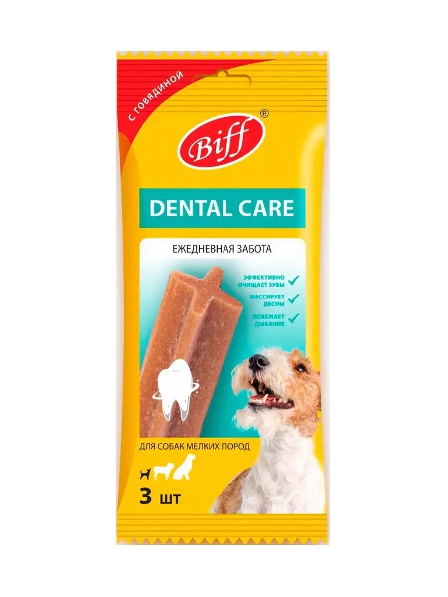 Biff Dental Care - это жевательный снек, необходимый для ежедневного ухода за ротовой полостью собак. Особая текстура и форма способствуют эффективному снятию мягкого зубного налета, снижению риска образования зубного камня и массажу десен. Фитокомплекс экстрактов растений предотвращает размножение вредных бактерий и освежает дыхание. Хранить при температуре от +4˚С до +25˚С и относительной влажности не более 75%.