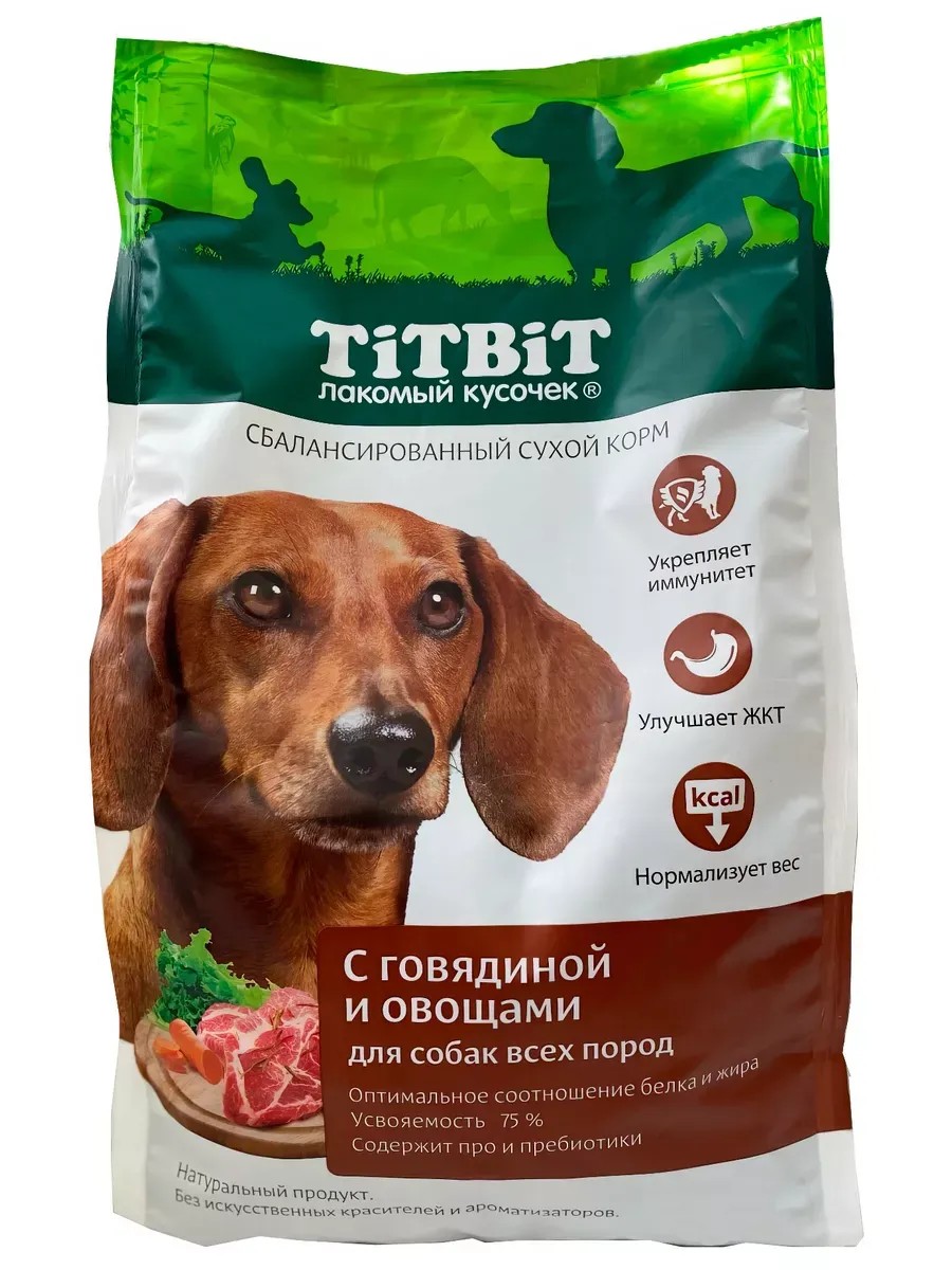 TiTBiT Dog Food, Beef with Vegetables, 2.2 kg. TiTBiT Dog Food, Beef with Vegetables, 2.2 kg. TiTBiT balanced dry food with beef and vegetables for dogs of all breeds over 1 year old. The optimal ratio of proteins and fats ensures the satisfaction of the needs of an adult animal. Contains all the vitamins, minerals, and microelements necessary for healthy development. The recipe includes ingredients that help provide your dog with the energy necessary for an active life. Ingredients: cereals, meat and meat by-products (including 4% beef), bran, chicken fat, hydrolyzed beef liver, brewer's yeast, egg powder, carrots, pumpkin, mannan-oligosaccharides (MOS), OLIN probiotic, chicory root, taurine, antioxidant complex, vitamins and minerals. Added substances: Vitamins per 1 kg of product: vitamin A 8000 IU, vitamin D 800 IU, vitamin E 30 mg, vitamin C 100 mg, as well as B vitamins (B1, B2, B6, B9 and B12). Microelements per 1 kg of product: iron 35 mg, copper 7 mg, zinc 90 mg, selenium 0.2 mg, manganese 4.5 mg. Shelf life: 18 months. Storage conditions: Store at a temperature of +4 C to +25 C and a relative humidity of no more than 75%. Feeding standards:
