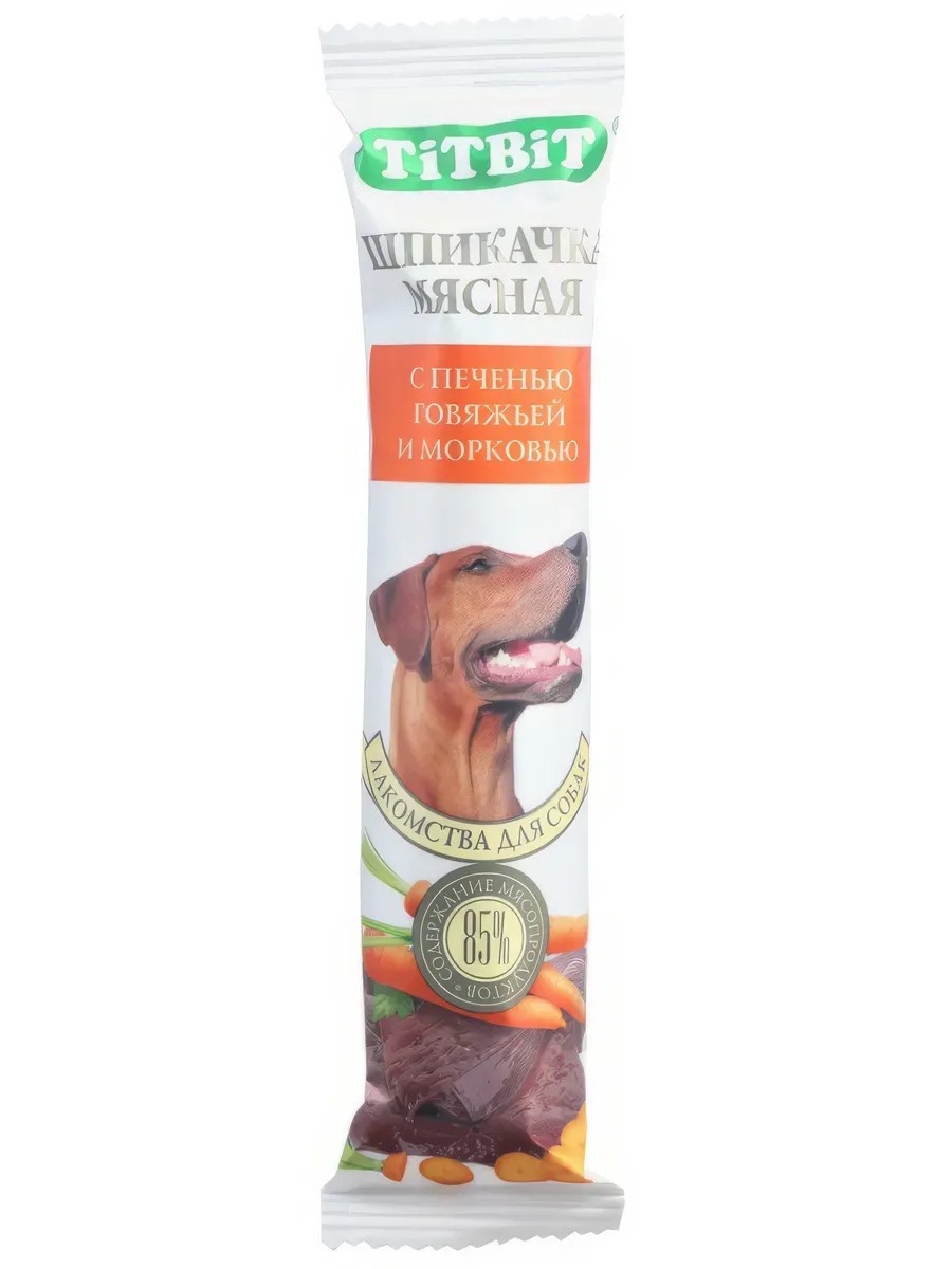Лакомство TiTBiT шпикачка для собак, с говяжьей печенью и морковью, 50 г, 9 шт. Колбаски для собак Шпикачка. Изготовлены из говяжьего мяса и мясных субпродуктов по колбасной технологии с добавлением таких полезных компонентов, как кукуруза, тыква и легкое говяжье. Натуральный продукт, который не содержит красителей и консервантов. Состав: мясо и мясные субпродукты (более 85%), кукуруза, морковь, минеральные вещества. Пищевая ценность в 100 г: белки 62,8 г, жиры 9,6 г, зола 2,7 г, влага 8,7 г. Энергетическая ценность на 100 г: 431 ккал. Срок годности (мес) - 12 Условия хранения Хранить при температуре от +4 С до +25 С и относительной влажности не более 75%.