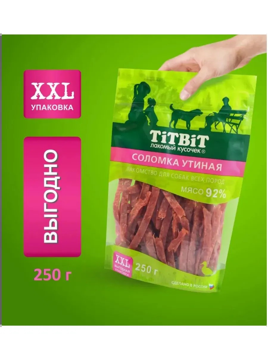 Соломка утиная Titbit - это аппетитное угощение для собак всех пород. Благодаря высокому содержанию мяса (92%) и бережной технологии приготовления, имеет привлекательный внешний вид и вкус. Мясо и мясные субпродукты, входящие в основу соломки, являются превосходным источником высококачественного животного белка, витаминов и минералов. Выгодная XXL упаковка с удобным замком zip-lock сохранит лакомство и продлит удовольствие Вашего любимца. Состав: мясо и мясные субпродукты (утка 92%), растительные масла, мальтодекстрин. Пищевая ценностьв 100 г: белки 59 г, жиры 16 г, зола 6 г, влага 16 г. Энергетическая ценность на 100 г: 392 ккал.