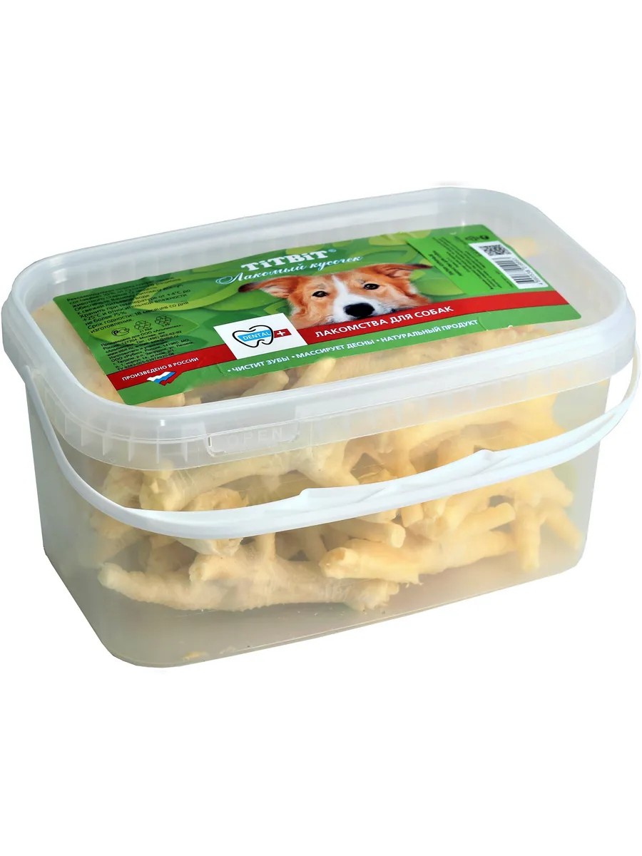 TiTBiT Chicken Feet Dog Treats, 400g. High in cartilage and connective tissue. Provides additional nutrients for growth, development, and joint maintenance. This attractive treat for small breed dogs doubles as a toy, cleans teeth, and massages gums. Use with caution for dogs allergic to chicken protein. This treat contains a tubular bone and is not intended for complete consumption. Once the dog has consumed the skin, tendons, and muscle sheath, replace the treat with a new one. Ingredients: Chicken Feet. Nutritional value: Protein 49g, Fat 39g, Ash 2g, Moisture 10g, 547 kcal.