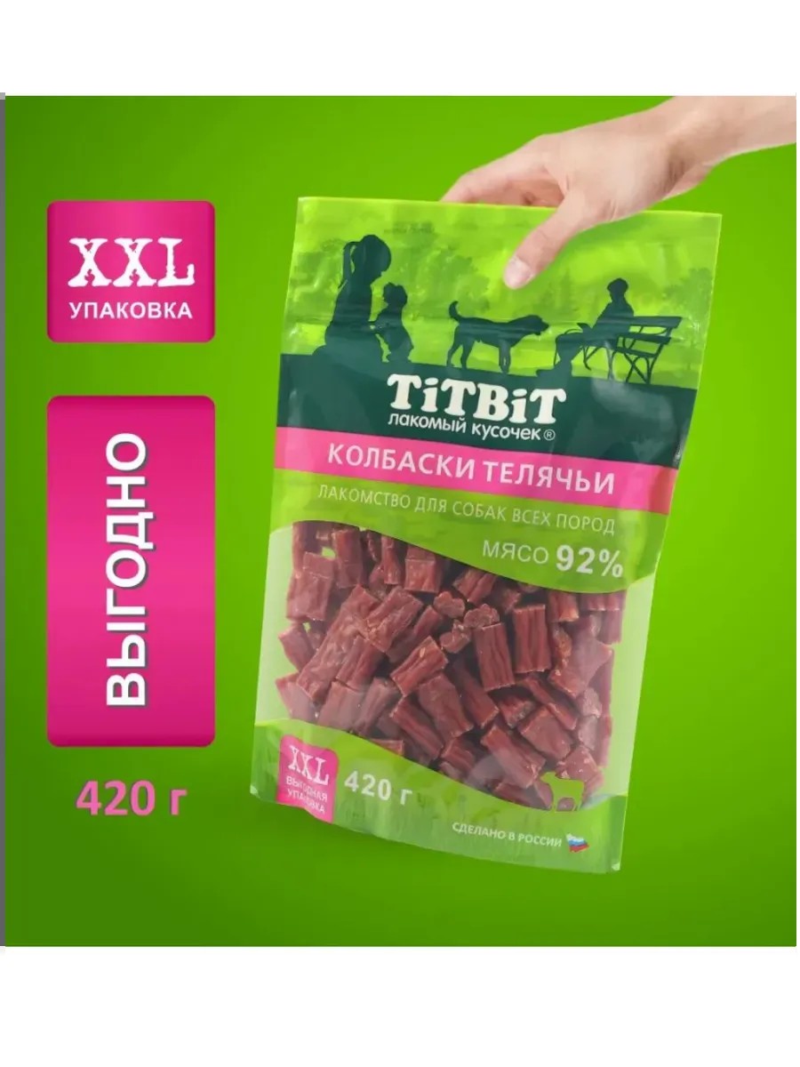Колбаски телячьи Titbit - это аппетитное угощение для собак всех пород. Благодаря высокому содержанию мяса (92%) и бережной технологии приготовления, имеет привлекательный внешний вид и вкус. Мясо и мясные субпродукты, входящие в основу колбасок, являются превосходным источником высококачественного животного белка, витаминов и минералов. Выгодная XXL упаковка с удобным замком zip-lock сохранит лакомство и продлит удовольствие Вашего любимца.
