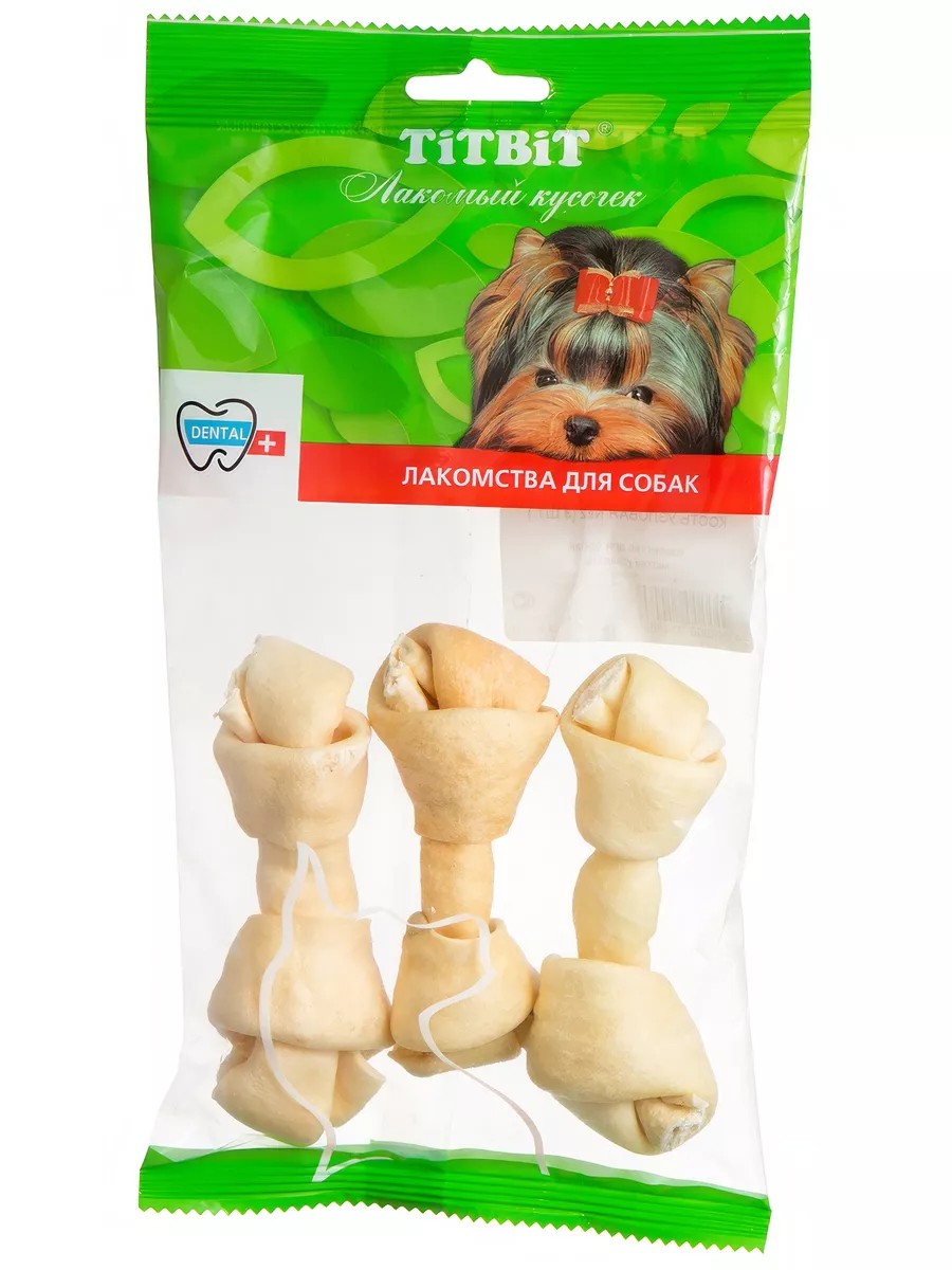 TiTBiT Treats for Dogs, No. 2 Knotted Bone (3 pcs), 40 g. : Dried beef skin, rolled into the shape of a bone measuring 90-110 mm. There are 3 pieces in the package. Due to the high content of amino acids and collagen, it has a positive effect on the condition of the skin and coat of the dog, and also provides the body with essential components for the growth and maintenance of the quality of cartilage tissue in dog joints. Helps strengthen gums, remove plaque and prevent the formation of tartar. Purpose: for brushing teeth, for encouragement. Composition: beef skin. Nutritional value per 100 g: proteins 67 g, fats 20 g, ash 2 g, moisture 10 g. Energy value per 100 g: 452 kcal. Shelf life: 18 months. Storage conditions: Store at a temperature of + 4 ° C to + 25 ° C and a relative humidity of no more than 75%.