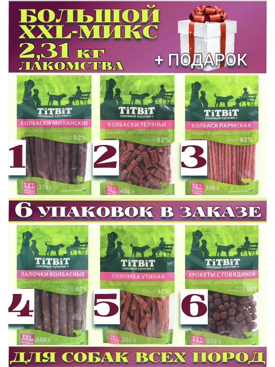 Набор лакомств для собак представляет собой шесть больших упаковок XXL, содержащих различные мясные вкусняшки. В общей сложности, это 2310 грамм счастья для вашего питомца.