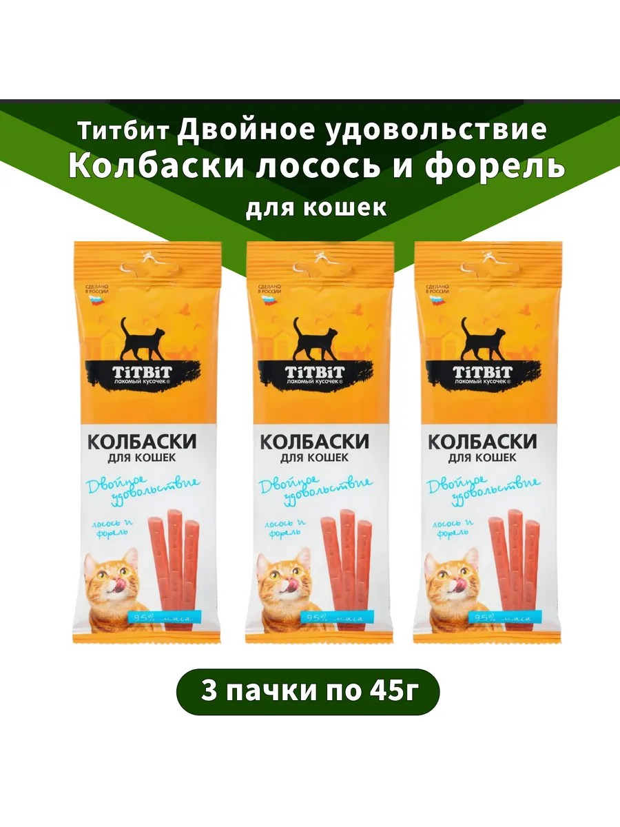 TiTBiT Double Delight Cat Sausages with Salmon and Trout, 45g Double Delight cat sausages are a double-flavored treat that cats love. Ingredients: meat and by-products, fish and by-products (including salmon - 8%, trout - 8%), vegetable oils, rice flour, minerals, antioxidants, preservatives, natural carmine color. Energy value per 100g: 368 kcal. Protein 57g, fat 12g, fiber 3g, ash 5g, moisture 15g.