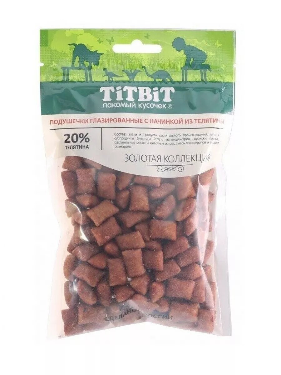 Золотая коллекция – это линейка лучших лакомств TITBIT, разработанных при участии владельцев домашних животных и их питомцев. Подушечки с начинкой - это аппетитные лакомства, которые, благодаря нежной мясной начинке и уникальному верхнему слою, имеют привлекательный внешний вид и невероятный вкус. Хрустящие подушечки в мясной обливке, напоминающей кондитерскую глазурь для людей. Как и глазурь, обливка придает особый вкус продукту, который понравится даже самому привередливому питомцу. Она абсолютно безопасна и не содержит сахара. Телятина, входящая в основу начинки, обогащает организм высококачественным животным белком, минералами, витаминами и аминокислотами.
