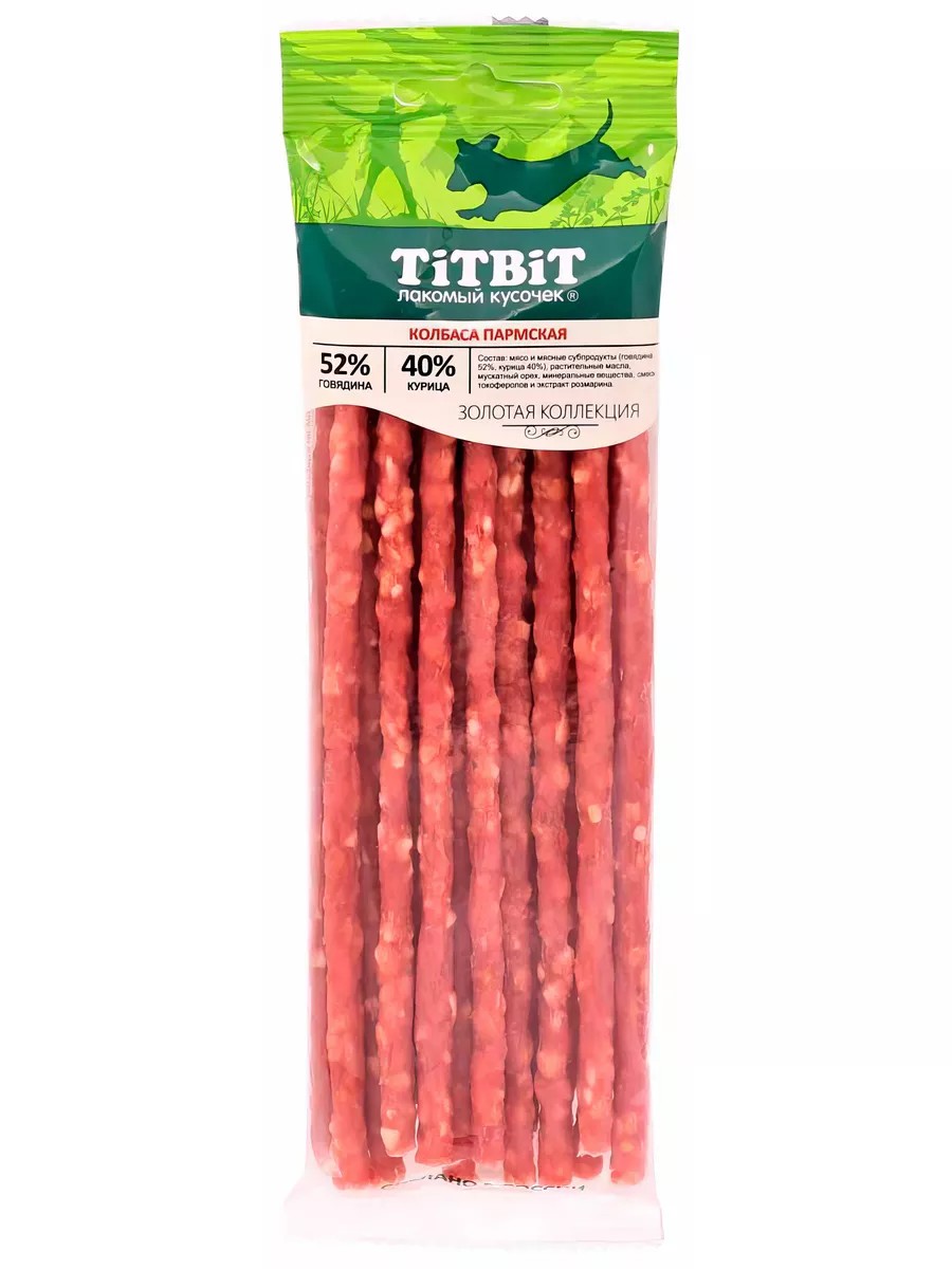TiTBiT Gold Collection Parma Sausage Treat for Dogs, 80g. TiTBiT Gold Collection Parma Sausage Treat for Dogs, 80g. The Gold Collection is a line of TITBIT's finest treats, developed with the input of pet owners and their pets. Parma sausage is made from beef and chicken fillet and complemented with a pinch of nutmeg, which adds sophistication to the delicate flavor. Ingredients: meat and by-products (beef 52%, chicken 40%), vegetable oils, nutmeg, minerals, mixed tocopherols, and rosemary extract. Nutritional value: per 100 g: protein 62 g, fat 14 g, ash 4 g, moisture 20 g. Energy value per 100 g: 374 kcal. Shelf life: 12 months. Store at temperatures from +4 C to +25 C and a relative humidity of no more than 75%.