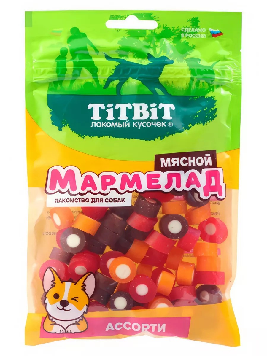 TiTBiT Meat Marmalade Treats for Dogs, Assorted, 120g. TiTBiT Meat Marmalade Treats for Dogs, Assorted, 120g. Treat your pet to a delicious meat marmalade treat! This product is designed with your pet's physiological needs in mind and to ensure a healthy and active lifestyle. Each piece of this marmalade contains high-quality meat, which provides a great taste, and thanks to its elastic consistency, it helps strengthen gums and prevent plaque buildup. Ingredients: rice, meat and by-products, vegetable protein, fiber, lecithin, oils and animal fats, yeast extract, minerals, natural flavors, natural color. 100 g of product contains: proteins 7 g, fats 2.5 g, ash 2.5 g, fiber 2 g, moisture 20 g. Energy value per 100 g: 315 kcal. Shelf life: 12 months. Recommended consumption rate: 10% of the daily ration of an animal over 12 weeks old. Provide your pet with access to fresh drinking water. Storage conditions: Store at a temperature of +4 C to +25 C and a relative humidity of no more than 75%.